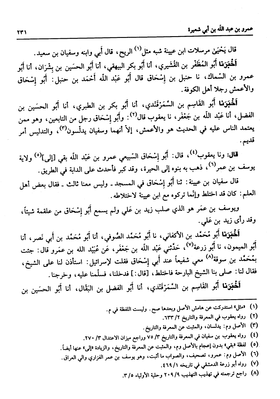 قال يحيى مرسلات ابن عيينة شبه مثل الريح (1) قال أبي وابنه وسفيان بن سعيد أخبرنا أبو المظفر بن القشيري أنا أبو بكر البيهقي أنا أبو الحسين بن بشران أنا أبو عمرو بن السماك نا حنبل بن إسحاق قال أبو عبد الله أحمد بن حنبل أبو إسحاق والأعمش رجلا أهل الكوفة أخبرنا أبو القاسم بن السمرقندي أنا أبو تبكر بن الطبري أنا أبو الحسين بن الفضل أنا عبد الله بن جعفر نا يعقوب قال (2) وأبو إسحاق رجل من التابعين وهو ممن يعتمد الناس عليه في الحديث هو والأعمش إلا أنهما وسفيان يدلسون (3) والتدليس أمر قديم قال ونا يعقوب (4) قال أبو إسحاق السبيعي عمرو بن عبد الله بقي إلى (5) ولاية يوسف بن عمر (6) ذهب به بنوه إلى الحيرة وقد كبر فأحدث على الدابة في الطريق قال سفيان بن عيينة ثنا أبو إسحاق في المسجد وليس معنا ثالث فقال بعض أهل العلم كان قد اختلط وإنما تركوه مع ابن عيينة لاختلاطه ويوسف بن عمر هو الذي صلب يزيد بن علي ولم يسمع أبو إسحاق من علقمة شيئا وقد رأى زيد بن علي أخبرنا أبو محمد بن الأكفاني نا أبو محمد الصوفي أنا أبو محمد بن أبي نصر أنا أبو الميمون نا أبو زرعة (7) حدثني عبد الله بن جعفر عن عبيد الله بن عمرو قال جئت بمحمد بن سوقة (8) معي شفيعا عند أبي إسحاق فقلت لإسرائيل استأذن لنا على الشيخ فقال لنا صلى بنا الشيخ البارحة فاختلط قال فدخلنا فسلمنا عليه وخرجنا أخبرنا أبو القاسم بن السمرقندي أنا أبو الفضل بن البقال أنا أبو الحسين بن