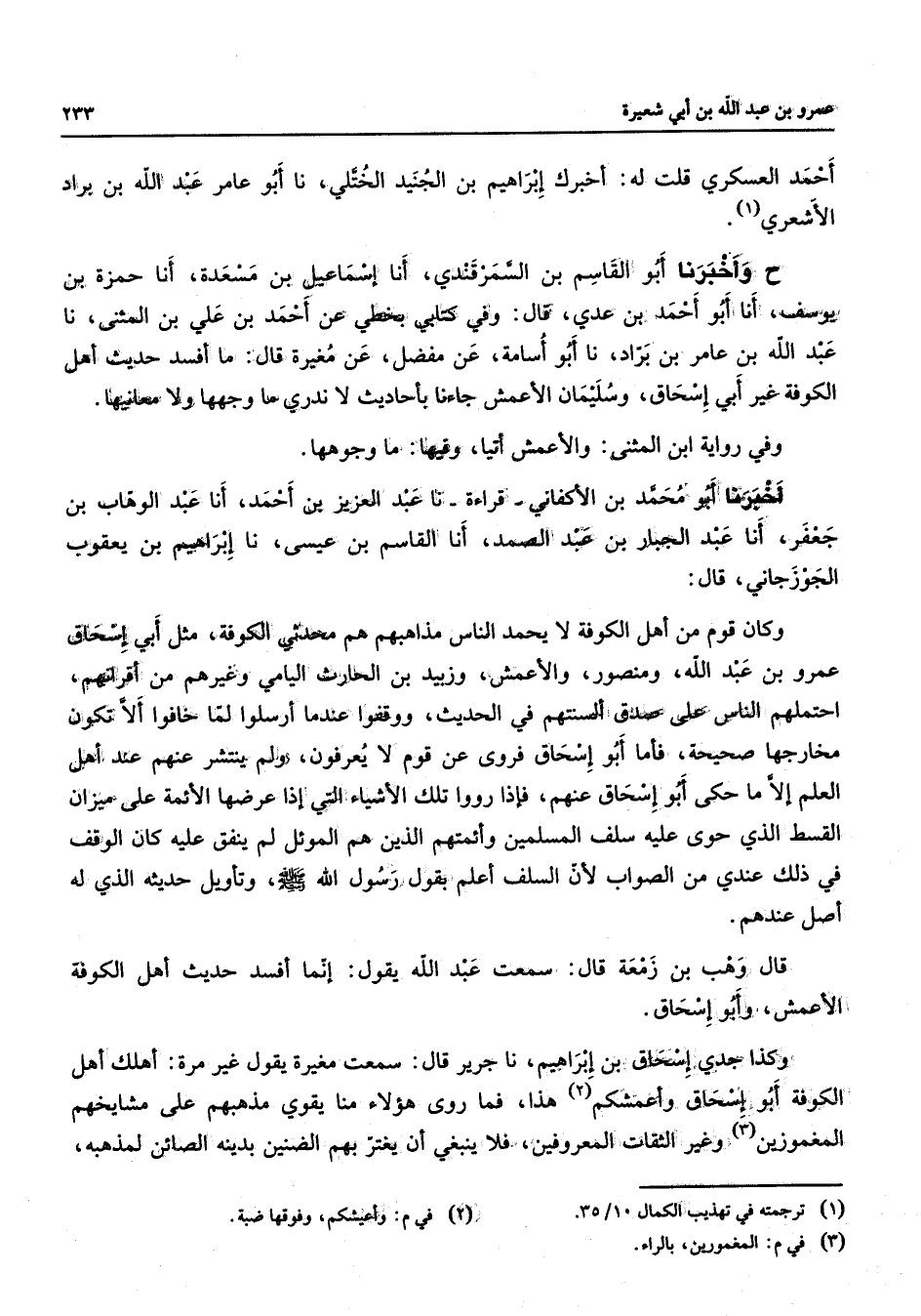 أحمد العسكري قلت له أخبرك إبراهيم بن الجنيد الختلي نا أبو عامر عبد الله بن براد الأشعري (1) ح وأخبرنا أبو القاسم بن السمرقندي أنا إسماعيل بن مسعدة أنا حمزة بن يوسف أنا أبو أحمد بن عدي قال وفي كتابي بخطي عن أحمد بن علي بن المثنى نا عبد الله بن عامر بن براد نا أبو أسامة عن مفضل عن مغيرة قال ما أفسد حديث أهل الكوفة غير أبي إسحاق وسليمان الأعمش جاءنا بأحاديث لا ندري ما وجهها ولا معانيها وفي رواية ابن المثنى والأعمش أتيا وفيها ما وجوهها أخبرنا أبو محمد بن الأكفاني قراءة نا عبد العزيز بن أحمد أنا عبد الوهاب بن جعفر أنا عبد الجبار بن عبد الصمد أنا القاسم بن عيسى نا إبراهيم بن يعقوب الجوزجاني قال وكان قوم من أهل الكوفة لا يحمد الناس مذاهبهم هم محدثي الكوفة مثل أبي إسحاق عمرو بن عبد الله ومنصور والأعمش وزبيد بن الحارث اليامي وغيرهم من أقرانهم احتملهم الناس على صدق ألسنتهم في الحديث ووقفوا عندما أرسلوا لما خافوا ألا تكون مخارجها صحيحة فأما أبو إسحاق فروى عن قوم لا يعرفون ولم ينتشر عنهم عند أهل العلم إلا ما حكى أبو إسحاق عنهم فإذا رووا تلك الأشياء التي إذا عرضها الأئمة على ميزان القسط الذي حوى عليه سلف المسلمين وأئمتهم الذين هم الموئل لم ينفق عليه كان الوقف في ذلك عندي من الصواب لأن السلف أعلم بقول رسول الله (صلى الله عليه وسلم) وتأويل حديثه الذي له أصل عندهم قال وهب بن زمعة قال سمعت عبد الله يقول إنما أفسد حديث أهل الكوفة الأعمش وأبو إسحاق وكذا جدي إسحاق بن إبراهيم نا جرير قال سمعت مغيرة يقول غير مرة أهلك أهل الكوفة أبو إسحاق وأعمشكم (2) هذا فما روى هؤلاء منا يقوي مذهبهم على مشايخهم المغموزين (3) وغير الثقات المعروفين فلا ينبغي أن يغتر بهم الضنين بدينه الصائن لمذهبه