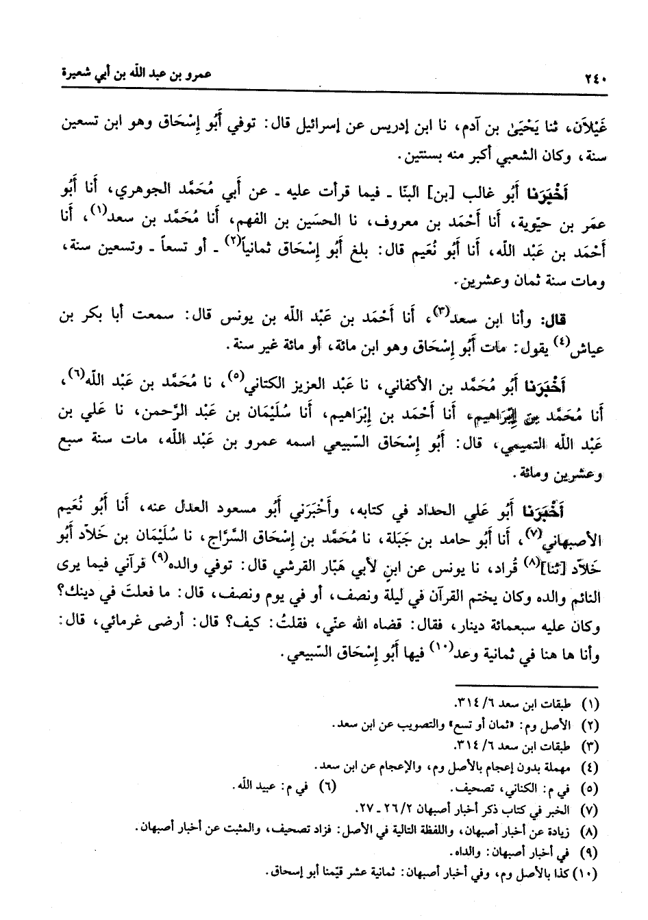 غيلان ثنا يحيى بن آدم نا ابن إدريس عن إسرائيل قال توفي أبو إسحاق وهو ابن تسعين سنة وكان ال شعبي أكبر منه بسنتين أخبرنا أبو غالب بن البنا فيما قرأت عليه عن أبي محمد الجوهري أنا أبو عمر بن حيوية أنا أحمد بن معروف نا الحسين بن الفهم أنا محمد بن سعد (1) أنا أحمد بن عبد الله أنا أبو نعيم قال بلغ أبو إسحاق ثمانيا (2) أو تسعا وتسعين سنة ومات سنة ثمان وعشرين قال وأنا ابن سعد (3) أنا أحمد بن عبد الله بن يونس قال سمعت أبا بكر بن عياش (4) يقول مات أبو إسحاق وهو ابن مائة أو مائة غير سنة أخبرنا أبو محمد بن الأكفاني نا عبد العزيز الكتاني (5) نا محمد بن عبد الله (6) أنا محمد بن إبراهيم أنا أحمد بن إبراهيم أنا سليمان بن عبد الرحمن نا علي بن عبد الله التميمي قال أبو إسحاق السبيعي اسمه عمرو بن عبد الله مات سنة سبع وعشرين ومائة أخبرنا أبو علي الحداد في كتابه وأخبرني أبو مسعود العدل عنه أنا أبو نعيم الأصبهاني (7) أنا أبو حامد بن جبلة نا محمد بن إسحاق السراج نا سليمان بن خلاد أبو خلاد (8) ثنا قراد نا يونس عن ابن لأبي هابر القرشي قال توفي والده (9) فرآني فيما يرى النائم والده وكان يختم القرآن في ليلة ونصف أو في يوم ونصف قال ما فعلت في دينك وكان عليه سبعمائة دينار فقال قضاه الله عني فقلت كيف قال أرضى غرمائي قال وأنا ها هنا في ثمانية وعد (10) فيها أبو إسحاق السبيعي