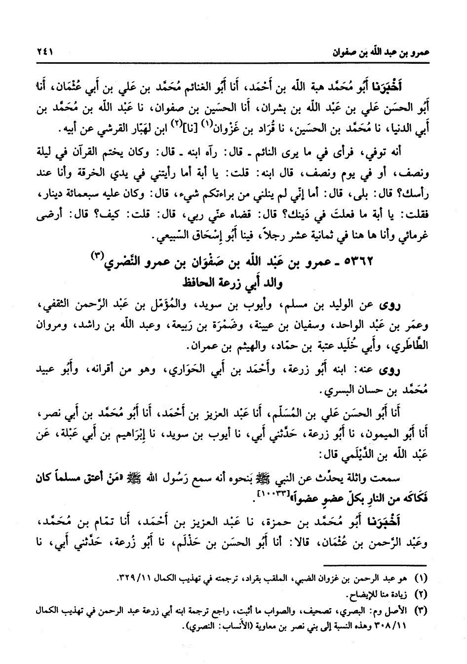 5362 - عمرو بن عبد الله بن صفوان بن عمرو النصري (3) والد أبي زرعة الحافظ روى عن الوليد بن مسلم وأيوب بن سويد والمؤمل بن عبد الرحمن الثقفي وعمر بن عبد الواحد وسفيان بن عيينة وضمرة بن ربيعة وعبد الله بن راشد ومروان الطاطري وأبي خليد عتبة بن حماد والهيثم بن عمران روى عنه ابنه أبو زرعة وأحمد بن أبي الحواري وهو من أقرانه وأبو عبيد محمد بن حسان البسري أنا أبو الحسن علي بن المسلم أنا عبد العزيز بن أحمد أنا أبو محمد بن أبي نصر أنا أبو الميمون نا أبو زرعة حدثني أبي نا أيوب بن سويد نا إبراهيم بن أبي عبلة عن عبد الله بن الديلمي قال سمعت واثلة يحدث عن النبي (صلى الله عليه وسلم) بنحوه أنه سمع رسول الله (صلى الله عليه وسلم) من أعتق مسلما كان فكاكه من النار بكل عضو عضوا