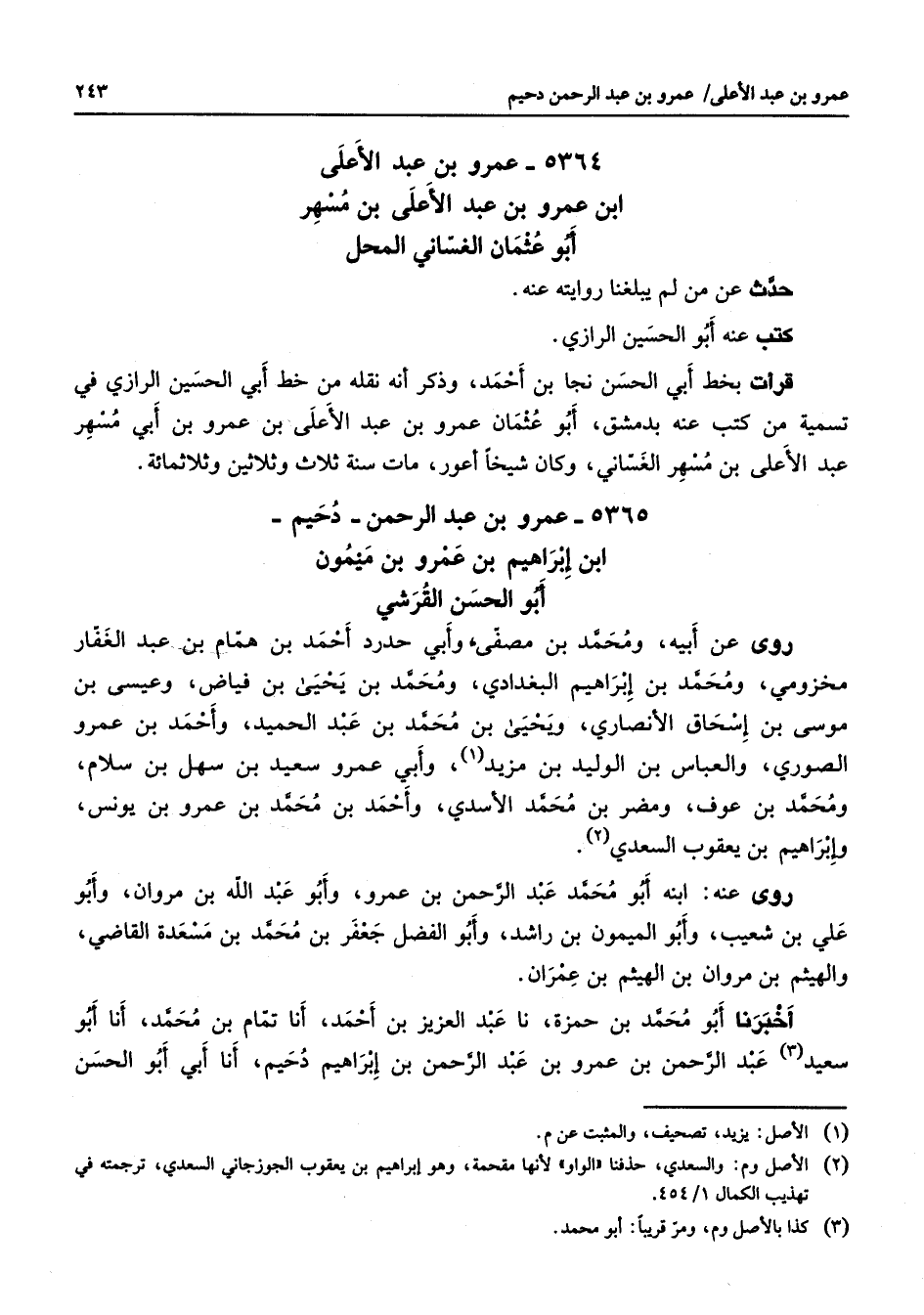 5364 - عمرو بن عبد الأعلى بن عمرو بن عبد الأعلى بن مسهر أبو عثمان الغساني المحل حدث عن من لم يبلغنا روايته عنه كتب عنه أبو الحسين الرازي قرأت بخط أبي الحسن نجا بن أحمد وذكر أنه نقله من خط أبي الحسين الرازي في تسمية من كتب عنه بدمشق أبو عثمان عمرو بن عبد الأعلى بن عمرو بن أبي مسهر عبد الأعلى بن مسهر الغساني وكان شيخا أعور مات سنة ثلاث وثلاثين وثلاثمائة 5365 عمرو بن عبد الرحمن دحيم ابن إبراهيم بن عمرو بن ميمون أبو الحسن القرشي روى عن أبيه ومحمد بن مصفى وأبي حدرد أحمد بن همام بن عبد الغفار مخزومي ومحمد بن إبراهيم البغدادي ومحمد بن يحيى بن فياض وعيسى بن موسى بن إسحاق الأنصاري ويحيى بن محمد بن عبد الحميد وأحمد بن عمرو الصوري والعباس بن الوليد بن مزيد (1) وأبي عمرو سعيد بن سهل بن سلام ومحمد بن عوف ومضر بن محمد الأسدي وأحمد بن محمد بن عمرو بن يونس وإبراهيم بن يعقوب السعدي (2) روى عنه ابنه أبو محمد عبد الرحمن بن عمرو وأبو عبد الله بن مروان وأبو علي بن شعيب وأبو الميمون بن راشد وأبو الفضل جعفر بن محمد بن مسعدة القاضي والهيثم بن مروان بن الهيثم بن عمران أخبرنا أبو محمد بن حمزة نا عبد العزيز بن أحمد أنا تمام بن محمد أنا أبو سعيد (3) عبد الرحمن بن عمرو بن عبد الرحمن بن إبراهيم دحيم أنا أبي أبو الحسن