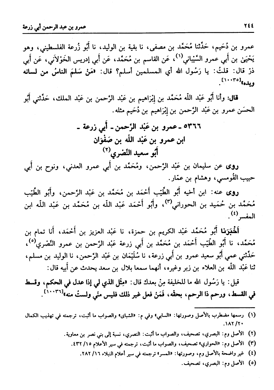 5366 - عمرو بن عبد الرحمن أبي زرعة بن عمرو بن عبد الله بن صفوان أبو سعيد النصري (2) روى عن سليمان بن عبد الرحمن ومحمد بن أبي عمرو العدني ونوح بن أبي حبيب القومسي وهشام بن عمار روى عنه ابن أخيه أبو الطيب أحمد بن محمد بن عبد الرحمن وأبو الطيب محمد بن حميد بن الحوراني (3) وأبو أحمد عبد الله بن محمد بن عبد الله ابن المفسر (4) أخبرنا أبو محمد عبد الكريم بن حمزة نا عبد العزيز بن أحمد أنا تمام بن محمد نا أبو الطيب أحمد بن محمد بن أبي زرعة عبد الرحمن بن عمرو النضري (5) حدثني عمي أبو سعيد عمرو بن أبي زرعة نا سليمان بن عبد الرحمن نا الوليد بن مسلم ثنا عبد الله بن العلاء بن زبر وغيره أنهما سمعا بلال بن سعد يحدث عن أبيه قال قيل يا رسول الله ما للخليفة من بعدك قال مثل الذي لي إذا عدل في الحكم وقسط في القسط ورحم ذا الرحم بحقه فمن فعل غير ذلك فليس مني ولست منه