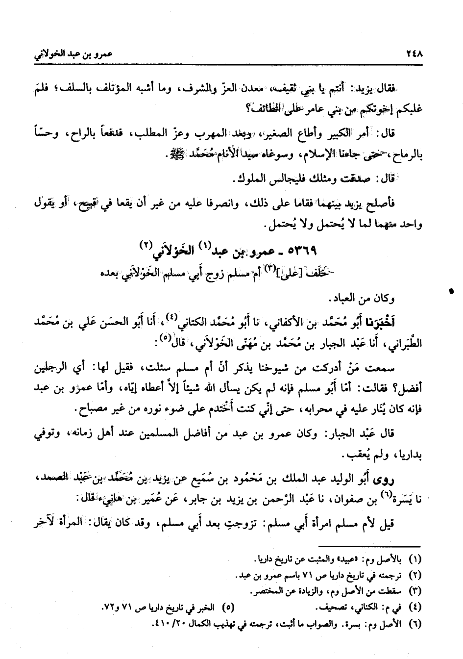 5369 - عمرو بن عبد (1) الخولاني (2) خلف على (3) أم مسلم زوج أبي مسلم الخولاني بعده وكان من العباد أخبرنا أبو محمد بن الأكفاني نا أبو محمد الكتاني (4) أنا أبو الحسن علي بن محمد الطبراني أنا عبد الجبار بن محمد بن مهنى الخولاني (5) قال سمعت من أدركت من شيوخنا يذكر أن أم مسلم سئلت فقيل لها أي الرجلين أفضل فقالت أما أبو مسلم فإنه لم يكن يسأل الله شيئا إلا أعطاه إياه وأما عمرو بن عبد فإنه كان ينار عليه في محرابه حتى إني كنت أختدم على ضوء نوره من غير مصباح قال عبد الجبار وكان عمرو بن عبد من أفاضل المسلمين عند أهل زمانه وتوفي بداريا ولم يعقب روى أبو الوليد عبد الملك بن محمود بن سميع عن يزيد بن محمد بن عبد الصمد نا يسرة (6) بن صفوان نا عبد الرحمن بن يزيد بن جابر عن عمير بن هانئ قال قيل لأم مسلم امرأة أبي مسلم تزوجت بعد أبي مسلم وقد كان يقال المرأة لآخر
