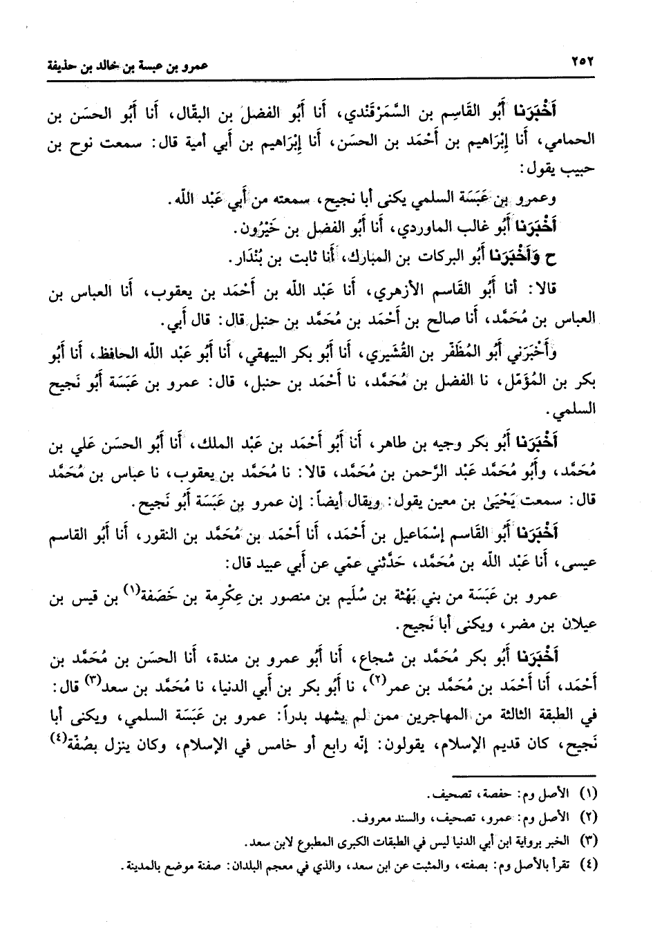 أخبرنا أبو القاسم بن السمرقندي أنا أبو الفضل بن البقال أنا أبو الحسن بن الحمامي أنا إبراهيم بن أحمد بن الحسن أنا إبراهيم بن أبي أمية قال سمعت نوح بن حبيب يقول وعمرو بن عبسة السلمي يكنى أبا نجيح سمعته من أبي عبد الله أخبرنا أبو غالب الماوردي أنا أبو الفضل بن خيرون ح وأخبرنا أبو البركات بن المبارك أنا ثابت بن بندار قالا أنا أبو القاسم الأزهري أنا عبد الله بن أحمد بن يعقوب أنا العباس بن العباس بن محمد أنا صالح بن أحمد بن محمد بن حنبل قال قال أبي وأخبرني أبو المظفر بن القشيري أنا أبو بكر البيهقي أنا أبو عبد الله الحافظ أنا أبو بكر بن المؤمل نا الفضل بن محمد نا أحمد بن حنبل قال عمرو بن عبسة أبو نجيح السلمي أخبرنا أبو بكر وجيه بن طاهر أنا أبو أحمد بن عبد الملك أنا أبو الحسن علي بن محمد وأبو محمد عبد الرحمن بن محمد قالا نا محمد بن يعقوب نا عباس بن محمد قال سمعت يحيى بن معين يقول ويقال أيضا إن عمرو بن عبسة أبو نجيح أخبرنا أبو القاسم إسماعيل بن أحمد أنا أحمد بن محمد بن النقور أنا أبو القاسم عيسى أنا عبد الله بن محمد حدثني عمي عن أبي عبيد قال عمرو بن عبسة من بني بهثة بن سليم بن منصور بن عكرمة بن خصفة (1) بن قيس بن عيلان بن مضر ويكنى أبا نجيح أخبرنا أبو بكر محمد بن شجاع أنا أبو عمرو بن مندة أنا الحسن بن محمد بن أحمد أنا أحمد بن محمد بن عمر (2) نا أبو بكر بن أبي الدنيا نا محمد بن سعد (3) قال في الطبقة الثالثة من المهاجرين ممن لم يشهد بدرا عمرو بن عبسة السلمي ويكنى أبا نجيح كان قديم الإسلام يقولون إنه رابع أو خامس في الإسلام وكان ينزل بصفة