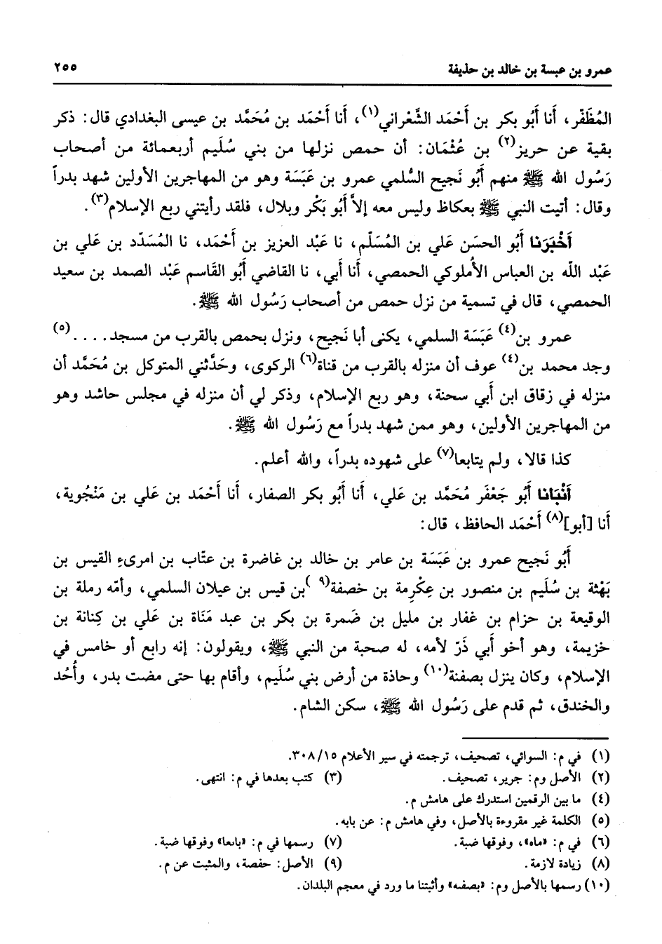 المظفر أنا أبو بكر بن أحمد الشعراني (1) أنا أحمد بن محمد بن عيسى البغدادي قال ذكر بقية عن حريز (2) بن عثمان أن حمص نزلها من بني سليم أربعمائة من أصحاب رسول الله (صلى الله عليه وسلم) منهم أبو نجيح السلمي عمرو بن عبسة وهو من المهاجرين الأولين شهد بدرا وقال أتيت النبي (صلى الله عليه وسلم) بعكاظ وليس معه إلا أبو بكر وبلال فلقد رأيتني ربع الإسلام (3) أخبرنا أبو الحسن علي بن المسلم نا عبد العزيز بن أحمد نا المسدد بن علي بن عبد الله بن العباس الأملوكي الحمصي أنا أبي نا القاضي أبو القاسم عبد الصمد بن سعيد الحمصي قال في تسمية من نزل حمص من أصحاب رسول الله (صلى الله عليه وسلم) عمرو بن (4) عبسة السلمي يكنى أبا نجيح ونزل بحمص بالقرب من مسجد