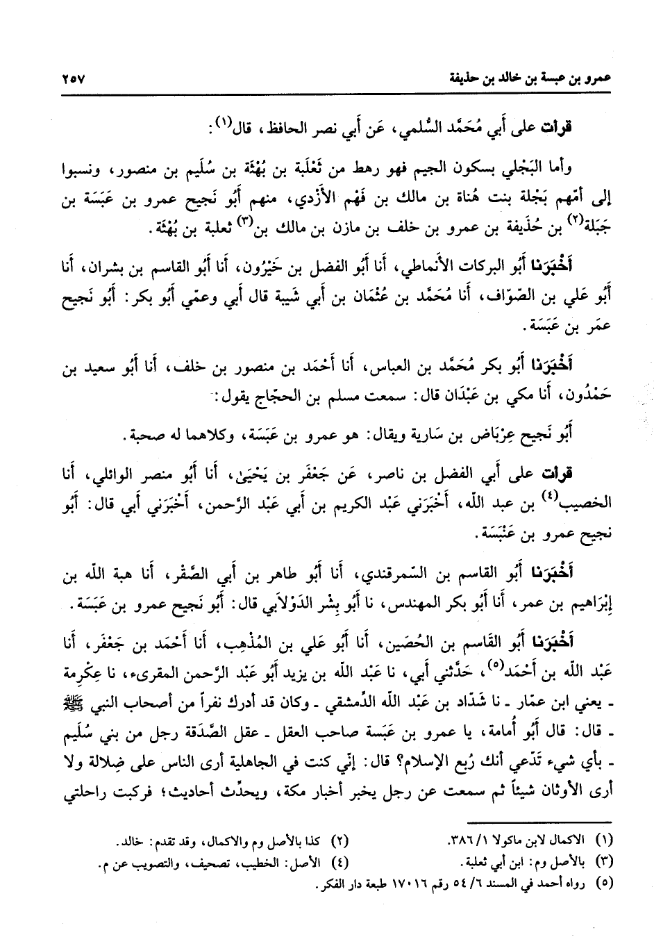 قرأت على أبي محمد السلمي عن أبي نصر الحافظ قال (1) وأما البجلي بسكون الجيم فهو رهط من ثعلبة بن بهثة بن سليم بن منصور ونسبوا إلى أمهم بجلة بنت هناة بن مالك بن فهم الأزدي منهم أبو نجيح عمرو بن عبسة بن جبلة (2) بن حذيفة بن عمرو بن خلف بن مازن بن مالك بن (3) ثعلبة بن بهثة أخبرنا أبو البركات الأنماطي أنا أبو الفضل بن خيرون أنا أبو القاسم بن بشران أنا أبو علي بن الصواف أنا محمد بن عثمان بن أبي شيبة قال أبي وعمي أبو بكر أبو نجيح عمر بن عبسة أخبرنا أبو بكر محمد بن العباس أنا أحمد بن منصور بن خلف أنا أبو سعيد بن حمدون أنا مكي بن عبدان قال سمعت مسلم بن الحجاج يقول أبو نجيح عرباض بن سارية ويقال هو عمرو بن عبسة وكلاهما له صحبة قرأت على أبي الفضل بن نصار عن جعفر بن يحيى أنا أبو منصر الوائلي أنا الخصيب (4) بن عبد الله أخبرني عبد الكريم بن أبي عبد الرحمن أخبرني أبي قال أبو نجيح عمرو بن عنبسة أخبرنا أبو القاسم بن السمرقندي أنا أبو طاهر بن أبي الصقر أنا هبة الله بن إبراهيم بن عمر أنا أبو بكر المهندس نا أبو بشر الدولابي قال أبو نجيح عمرو بن عبسة أخبرنا أبو القاسم بن الحصين أنا أبو علي بن المذهب أنا أحمد بن جعفر أنا عبد الله بن أحمد (5) حدثني أبي نا عبد الله بن يزيد أبو عبد الرحمن المقرئ نا عكرمة يعني ابن عمار نا شداد بن عبد الله الدمشقي وكان قد أدرك نفرا من أصحاب النبي (صلى الله عليه وسلم) قال قال أبو أمامة يا عمرو بن عبسة صاحب العقل عقل الصدقة رجل من بني سليم بأي شئ تدعي أنك ربع الإسلام قال إني كنت في الجاهلية أرى الناس على ضلالة ولا أرى الاوثان شيئا ثم سمعت عن رجل يخبر أخبار مكة ويحدث أحاديث فركبت راحلتي