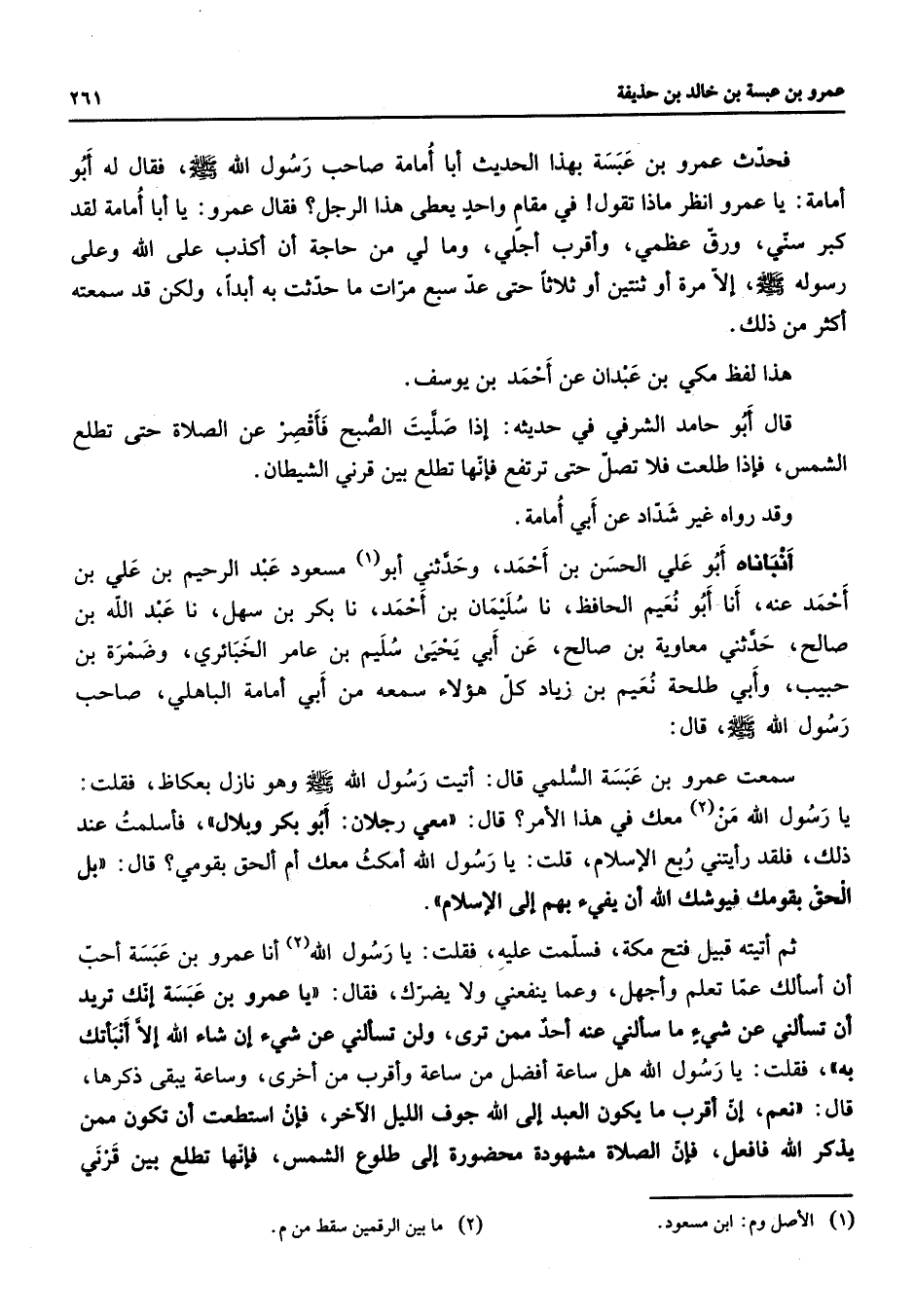 فحدث عمرو بن عبسة بهذا الحديث أبا أمامة صاحب رسول الله (صلى الله عليه وسلم) فقال له أبو أمامة يا عمرو انظر ماذا تقول في مقام واحد يعطى هذا الرجل فقال عمرو يا أبا أمامة لقد كبر سني ورق عظمي وأقرب أجلي وما لي من حاجة أن أكذب على الله وعلى رسوله (صلى الله عليه وسلم) إلا مرة أو ثنتين أو ثلاثا حتى عد سبع مرات ما حدثت به أبدا ولكن قد سمعته أكثر من ذلك هذا لفظ مكي بن عبدان عن أحمد بن يوسف قال أبو حامد الشرفي في حديثه إذا صليت الصبح فأقصر عن الصلاة حتى تطلع الشمس فإذا طلعت فلا تصل حتى ترتفع فإنها تطلع بين قرني الشيطان وقد رواه غير شداد عن أبي أمامة أنبأناه أبو علي الحسن بن أحمد وحدثني أبو (1) مسعود عبد الرحيم بن علي بن أحمد عنه أنا أبو نعيم الحافظ نا سليمان بن أحمد نا بكر بن سهل نا عبد الله بن صالح حدثني معاوية بن صالح عن أبي يحيى سليم بن عامر الخبائري وضمرة بن حبيب وأبي طلحة نعيم بن زياد كل هؤلاء سمعه من أبي امامة الباهلي صاحب رسول الله (صلى الله عليه وسلم) قال سمعت عمرو بن عبسة السلمي قال أتيت رسول الله (صلى الله عليه وسلم) وهو نازل بعكاظ فقلت يا رسول الله من (2) معك في هذا الأمر قال معي رجلان أبو بكر وبلال فأسلمت عند ذلك فلقد رأيتني ربع الإسلام قلت يا رسول الله أمكث معك أم ألحق بقومي قال بل الحق بقومك فيوشك الله أن يفئ بهم إلى الإسلام ثم أتيته قبيل فتح مكة فسلمت عليه فقلت يا رسول الله (2) أنا عمرو بن عبسة أحب أن أسألك عما تعلم وأجهل وعما ينفعني ولا يضرك فقال يا عمرو بن عبسة إنك تريد أن تسألني عن شئ ما سألني عنه أحد ممن ترى ولن تسألني عن شئ إن شاء الله إلا أنبأتك به فقلت يا رسول الله هل ساعة أفضل من ساعة وأقرب من أخرى وساعة يبقى ذكرها قال نعم إن أقرب ما يكون العبد إلى الله جوف الليل الآخر فإن استطعت أن تكون ممن يذكر الله فافعل فإن الصلاة مشهودة محضورة إلى طلوع الشمس فإنها تطلع بين قرني