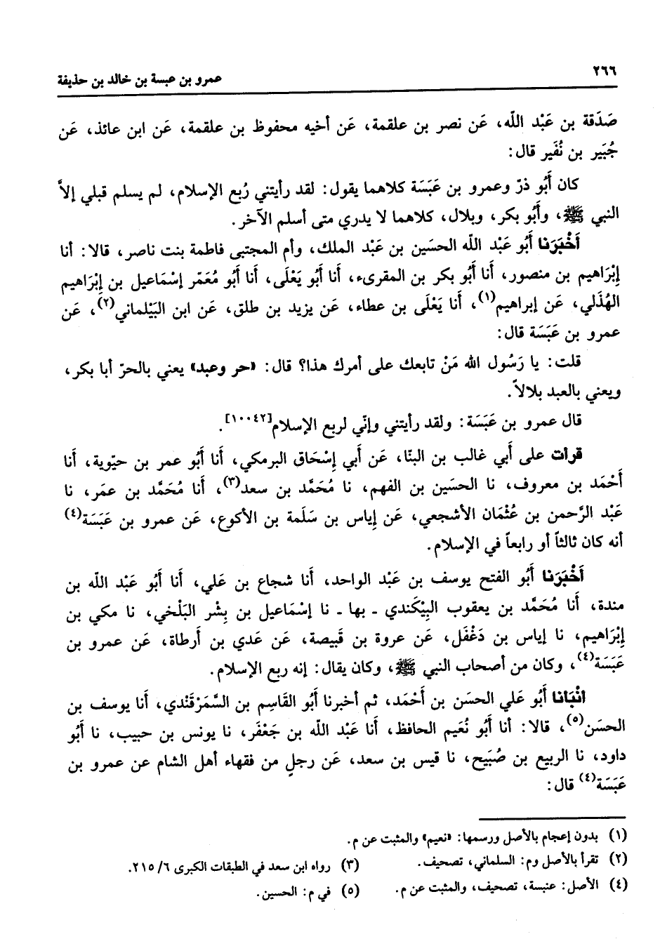 [10042] قرأت على أبي غالب بن البنا عن أبي إسحاق البرمكي أنا أبو عمر بن حيوية أنا أحمد بن معروف نا الحسين بن الفهم نا محمد بن سعد (3) أنا محمد بن عمر نا عبد الرحمن بن عثمان الأشجعي عن إياس بن سلمة بن الأكوع عن عمرو بن عبسة (4) أنه كان ثالثا أو رباعا في الإسلام أخبرنا أبو الفتح يوسف بن عبد الواحد أنا شجاع بن علي أنا أبو عبد الله بن مندة أنا محمد بن يعقوب البيكندي بها نا إسماعيل بن بشر البلخي نا مكي بن إبراهيم نا إياس بن دغفل عن عروة بن قبيصة عن عدي بن أرطاة عن عمرو بن عبسة (4) وكان من أصحاب النبي (صلى الله عليه وسلم) وكان يقال إنه ربع الإسلام أنبأنا أبو علي الحسن بن أحمد ثم أخبرنا أبو القاسم بن السمرقندي أنا يوسف بن الحسن (5) قالا أنا أبو نعيم الحافظ أنا عبد الله بن جعفر نا يونس بن حبيب نا أبو داود نا الربيع بن صبيح نا قيس بن سعد عن جل من فقهاء أهل الشام عن عمرو بن عبسة (4) قال