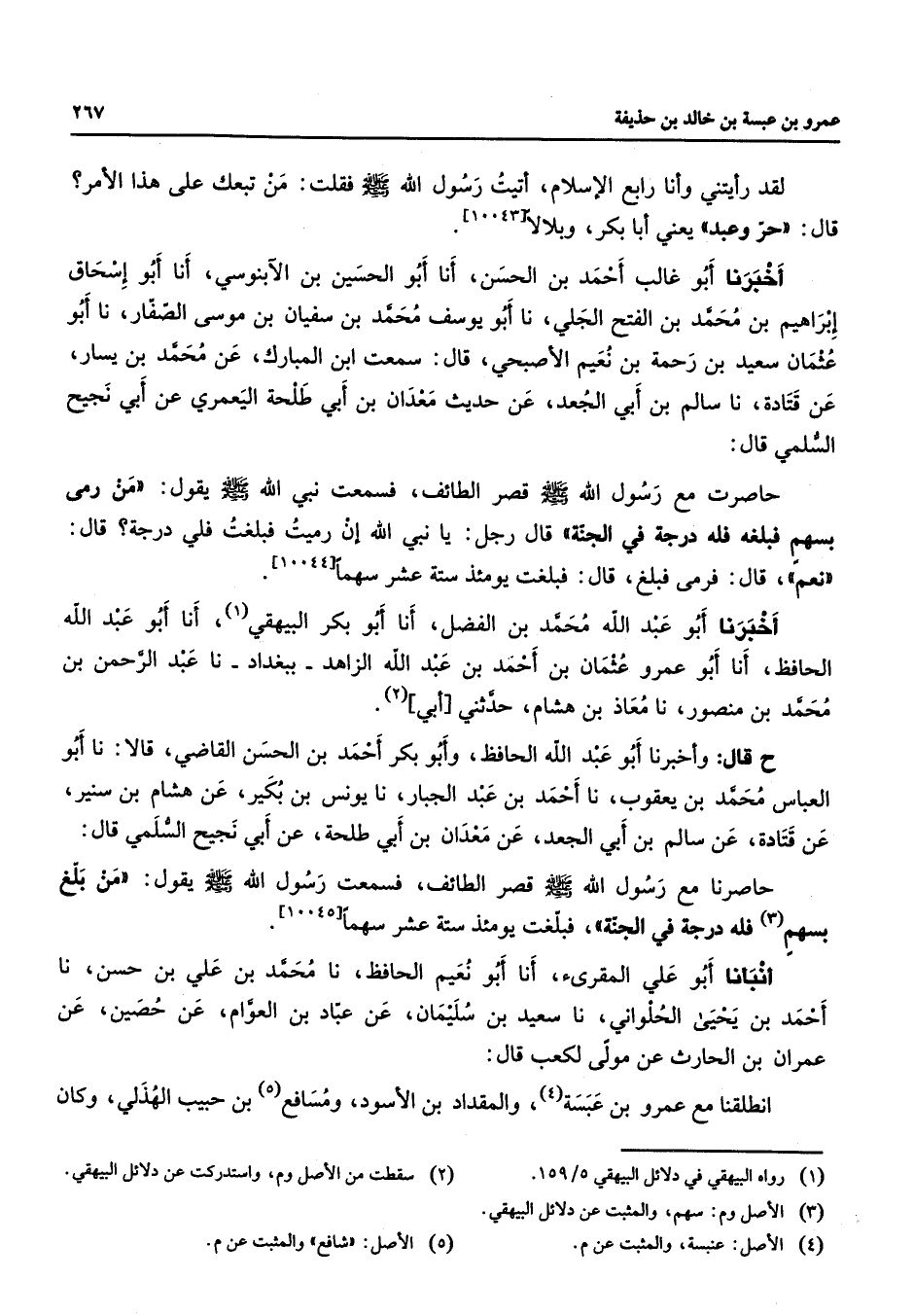 [10044] أخبرنا أبو عبد الله محمد بن الفضل أنا أبو بكر البيهقي (1) أنا أبو عبد الله الحافظ أنا أبو عمرو عثمان بن أحمد بن عبد الله الزاهد ببغداد نا عبد الرحمن بن محمد بن منصور نا معاذ بن هشام حدثني [أبي] (2) ح قال وأخبرنا أبو عبد الله الحافظ وأبو بكر أحمد بن الحسن القاضي قالا نا أبو العباس محمد بن يعقوب نا أحمد بن عبد الجبار نا يونس بن بكير عن هشام بن سنير عن قتادة عن سالم بن أبي الجعد عن معدان بن أبي طلحة عن أبي نجيح السلمي قال حاصرنا مع رسول الله (صلى الله عليه وسلم) قصر الطائف فسمعت رسول الله (صلى الله عليه وسلم) يقول من بلغ بسهم (3) فله درجة في الجنة فبلغت يومئذ ستة عشر سهما