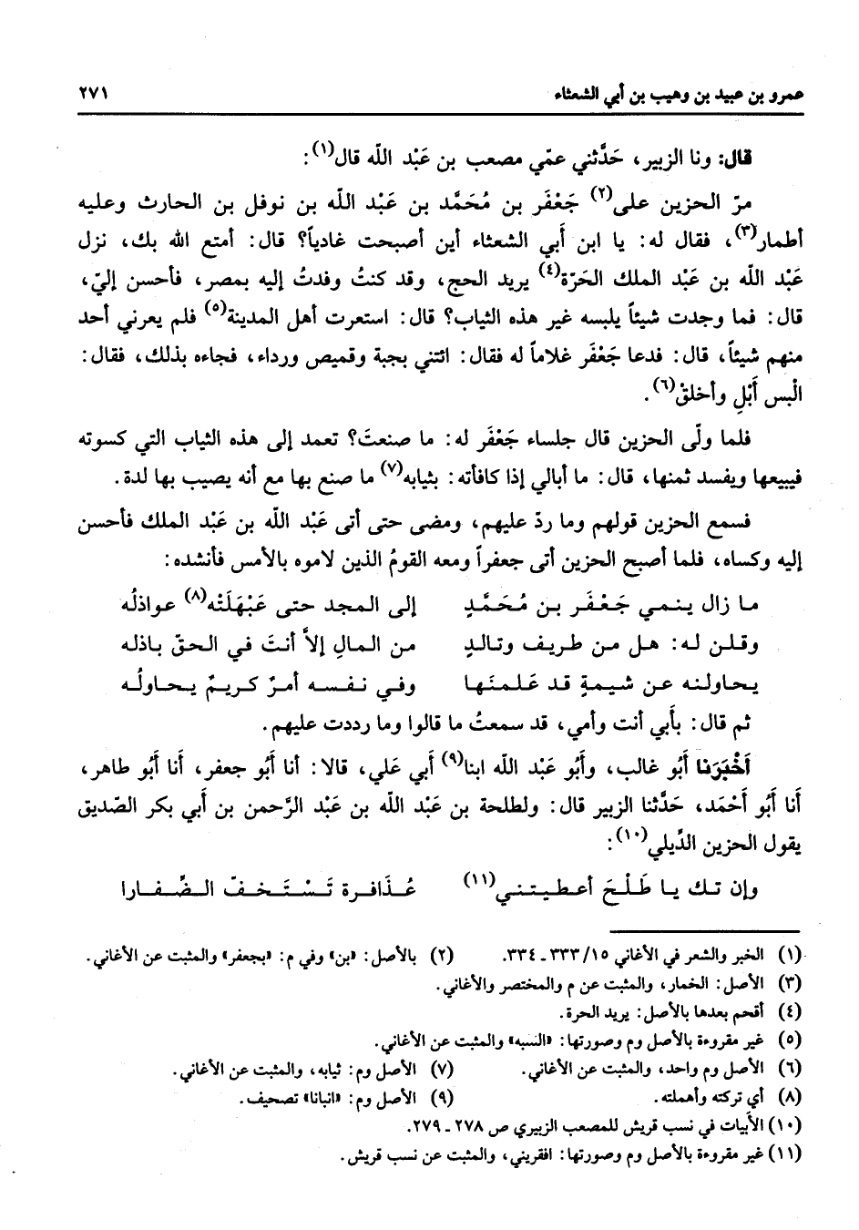 قال ونا الزبير حدثني عمي مصعب بن عبد الله قال (1) مر الحزين على (2) جعفر بن محمد بن عبد الله بن نوفل بن الحارث وعليه أطمار (3) فقال له يا ابن أبي الشعثاء أين أصبحت غاديا قال أمتع الله بك نزل عبد الله بن عبد الملك الحرة (4) يريد الحج وقد كنت وفدت إليه بمصر فأحسن إلي قال فما وجدت شيئا يلبسه غير هذه الثياب قال استعرت أهل المدينة (5) فلم يعرني أحد منهم شيئا قال فدعا جعفر غلاما له فقال ائتني بجبة وقيمص ورداء فجاءه بذلك فقال البس أبل وأخلق (6) فلما ولى الحزين قال جلساء جعفر له ما صنعت تعمد إلى هذه الثياب التي كسوته فيبيعها ويفسد ثمنها قال ما أبالي إذا كافأته بثيابه (7) ما صنع بها مع أنه يصيب بها لدة فسمع الحزين قولهم وما رد عليهم ومضى حتى أتى عبد الله بن عبد الملك فأحسن إليه وكساه فلما أصبح الحزين أتى جعفرا ومعه القوم الذين لاموه بالأمس فأنشده * ما زال ينمي جعفر بن محمد * إلى المجد حتى عبهلته (8) عواذلة وقلن له هل من طريف وتالد * من المال إلا أنت في الحق باذله يحاولنه عن شيمة قد علمنها * وفي نفسه أمر كريم يحاوله * ثم قال بأبي أنت وأمي قد سمعته ما قالوا وما رددت عليهم أخبرنا أبو غالب وأبو عبد الله ابنا (9) أبي علي قالا أنا أبو جعفر أنا أبو طاهر أنا أبو أحمد حدثنا الزبير قال ولطلحة بن عبد الله بن عبد الرحمن بن أبي بكر الصديق يقول الحزين الديلي (10) * وإن تك يا طلح أعطيتني (11) * عذافرة تستخف الضفارا