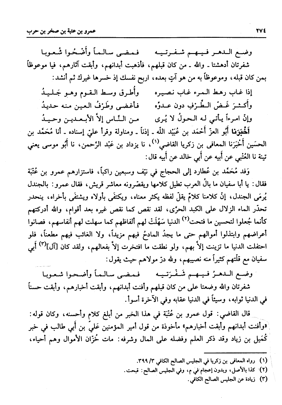 * وضع الدهر فيهم شفرتيه * فمضى سالما وأضحوا شعوبا * شفرتان أدهشتا والله من كان قبلهم فأذهبت أبدانهم وأبقت آثارهم فيا موعوظا بمن كان قبله وموعوظا به من هو آت بعده اربح نفسك إذ خسرها غيرك ثم أنشد * إذا غاب رهط المرء غاب نصيره * وأطرق وسط القوم وهو جليد وأكثر غض الطرف دون عدوه * فأغضي وطرف العين منه حديد وإن امرءا يأتي له الحول لا * من الناس إلا الأبعدين وحيد * أخبرنا أبو العز أحمد بن عبيد الله إذنا ومناولة وقرأ علي إسناده أنا محمد بن الحسين أخبرنا المعافى بن زكريا القاضي (1) نا يزداد بن عبد الرحمن نا أبو موسى يعني تينة نا العتبي عن أبيه عن أبي خالد عن أبيه قال وفد محمد بن عطارد إلى الحجاج في نيف وسبعين راكبا فاستزارهم عمرو بن عتبة فقال يا أبا سفيان ما بال العرب تطيل كلامها ويقصرونه معاشر قريش فقال عمرو بالجندل يرمى الجندل إن كلامنا كلام يقل لفظه يكثر معناه ويكتفي بأولاه ويشتفي بأخراه ينحدر تحدر الماء الزلال على الكبد الحري لقد نقص كما نقص غيره بعد أقوام والله أدركتهم كأنما جعلوا لتحسين ما فتحت (2) الدنيا سهلت لهم ألفاظهم كما سهلت لهم أنفاسهم فصانوا أعراضهم وابتذلوا أموالهم حتى ما يجد المادح فيهم مزيدا ولا الغائب فيهم مطعنا فلو احتفلت الدنيا ما تزينت إلا بهم ولو نطقت ما افتخرت إلا بفعالهم ولقد كان آل (3) أبي سفيان مع قلتهم كثيرا منه نصيبهم ولله در مولاهم حيث يقول * وضع الدهر فيهم شفرتيه * فمضى سالما وأضحوا شعوبا شفرتان والله وضعتا على من كان قبلهم وأفنت أبدانهم وأبقت أخبارهم وأبقت حسنا في الدنيا ثوابه وسيئا في الدنيا عقابه وفي الآخرة أسوأ قال القاضي قول عمرو بن عتبة في هذا الخبر من أبلغ كلام وأحسنه وكان قوله وأفنت أبدانهم وأبقت أخبارهم مأخوذة من قول أمير المؤمنين علي بن أبي طالب في خبر كميل بن زياد وقد ذكر العلم وفضله على المال وشرفه مات خزان الأموال وهم أحياء