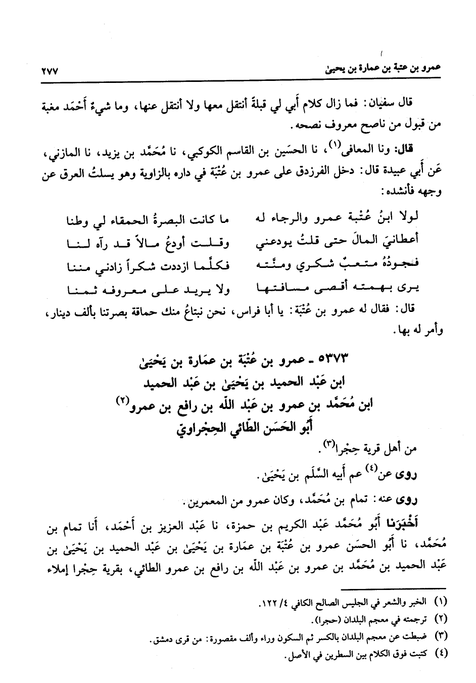 5373 - عمرو بن عتبة بن عمارة بن يحيى بن عبد الحميد بن يحيى بن عبد الحميد بن محمد بن عمرو بن عبد الله بن رافع بن عمرو (2) أبو الحسن الطائي الحجراوي من أهل قرية حجرا (3) روى عن (4) عم أبيه السلم بن يحيى روى عنه تمام بن محمد وكان عمرو بن المعمرين أخبرنا أبو محمد عبد الكريم بن حمزة نا عبد العزيز بن أحمد أنا تمام بن محمد نا أبو الحسن عمرو بن عتبة بن عمارة بن يحيى بن عبد الحميد بن يحيى بن عبد الحميد بن محمد بن عمرو بن عبد الله بن رافع بن عمرو الطائي بقرية حجرا إملاء