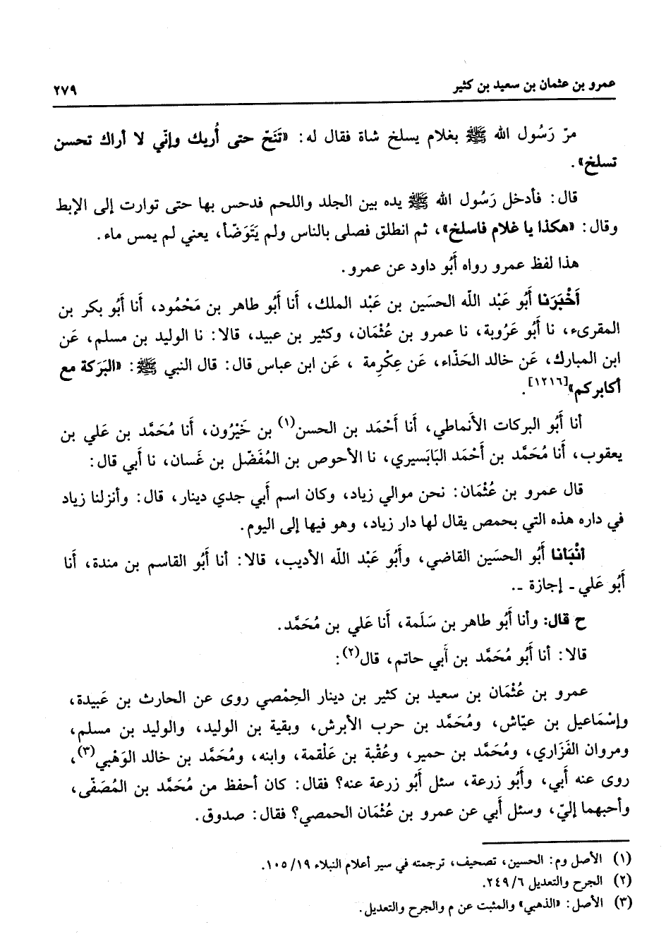 مر رسول الله (صلى الله عليه وسلم) بغلام يسلخ شاة فقال له تنح حتى أريك وإني لا أراك تحسن تسلخ قال فأدخل رسول الله (صلى الله عليه وسلم) يده بين الجلد واللحم فدحس بها حتى توارت إلى الإبط وقال هكذا يا غلام فاسلخ ثم انطلق فصلى بالناس ولم يتوضأ يعني لم يمس ماء هذا لفظ عمرو رواه أبو داود عن عمرو أخبرنا أبو عبد الله الحسين بن عبد الملك أنا أبو طاهر بن محمود أنا أبو بكر بن المقرئ نا أبو عروبة نا عمرو بن عثمان وكثير بن عبيد قالا نا الوليد بن مسلم عن ابن المبارك عن خالد الحذاء عن عكرمة عن ابن عباس قال قال النبي (صلى الله عليه وسلم) البركة مع أكابركم