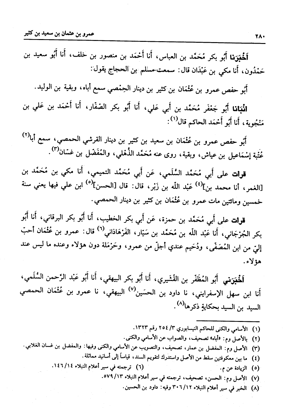 أخبرنا أبو بكر محمد بن العباس أنا أحمد بن منصور بن خلف أنا أبو سعيد بن حمدون أنا مكي بن عبدان قال سمعت مسلم بن الحجاج يقول أبو حفص عمرو بن عثمان بن كثير بن دينار الحمصي سمع أباه وبقية بن الوليد أنبأنا أبو جعفر محمد بن أبي علي أنا أبو بكر الصفار أنا أحمد بن علي بن منجوية أنا أبو أحمد الحاكم قال (1) أبو حفص عمرو بن عثمان بن سعيد بن كثير بن دينار القرشي الحمصي سمع أبا (2) عتبة إسماعيل بن عياش وبقية روى عنه محمد الذهلي والمفضل بن غسان (3) قرأت على أبي محمد السلمي عن أبي محمد التميمي أنا مكي بن محمد بن الغمر أنا محمد بن (4) عبد الله بن زبر قال قال الحسن (5) ابن علي فيها يعني سمة خمسين ومائتين مات عمرو بن عثمان بن كثير بن دينار الحمصي قرأت على أبي محمد بن حمزة عن أبي بكر الخطيب أنا أبو بكر البرقاني أنا أبو بكر الجرجاني أنا عبد الله بن محمد بن سيار الفرهاذاني (6) قال عمرو بن عثمان أحب إلي من ابن المصفى ودحيم عندي أجل من عمرو وحرملة دون هؤلاء وعنده ما ليس عند هؤلاء أخبرني أبو المظفر بن القشيري أنا أبو بكر البيهقي أنا أبو عبد الرحمن السلمي أنا ابن سهل الإسفرايني نا داود بن الحسين (7) البيهقي نا عمرو بن عثمان الحمصي السيد بن السيد بحكاية ذكرها (8)