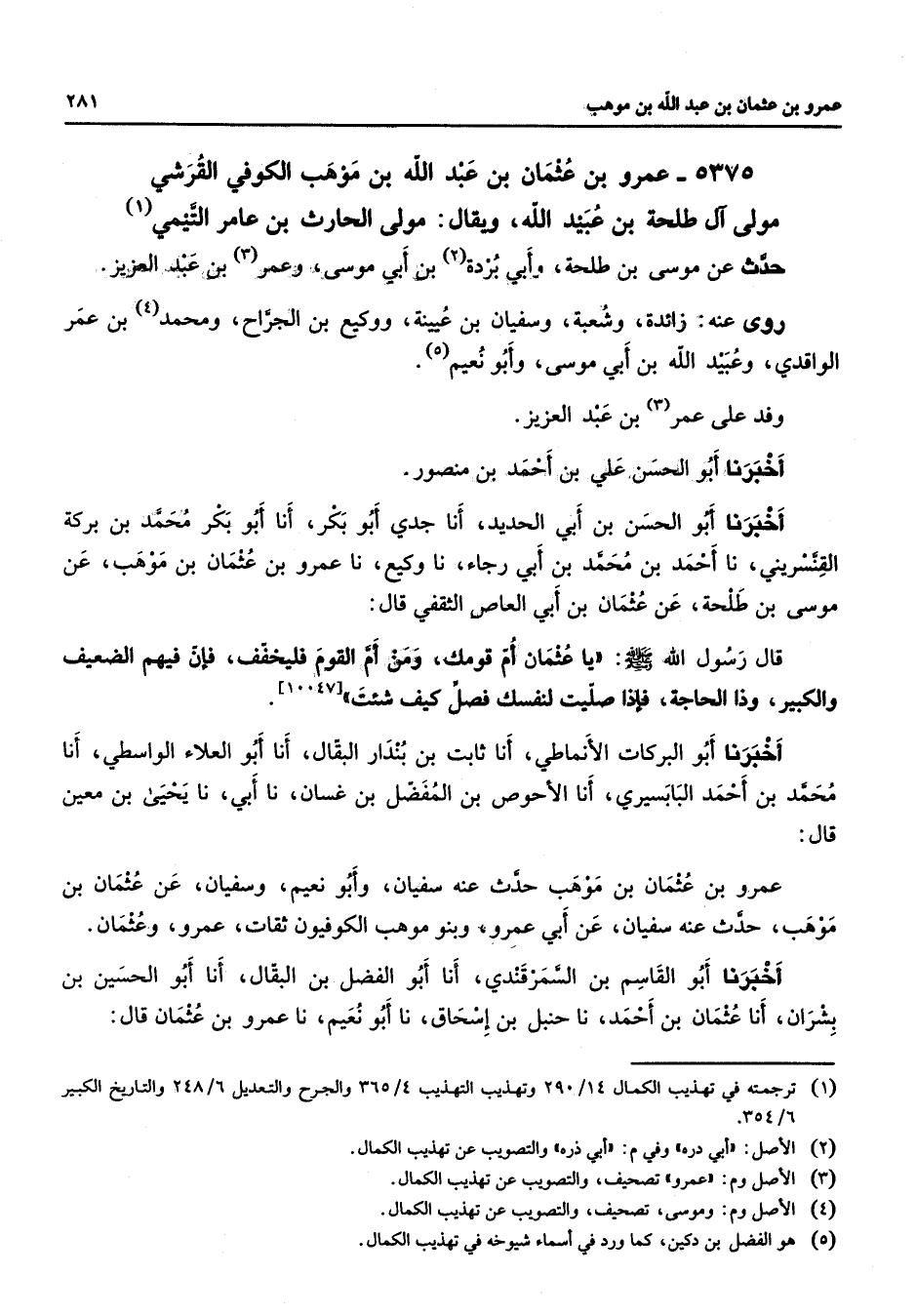 5375 - عمرو بن عثمان بن عبد الله بن موهب الكوفي القرشي مولى آل طلحة بن عبيد الله ويقال مولى الحارث بن عامر التيمي (1) حدث عن موسى بن طلحة وأبي بردة (2) بن أبي موسى وعمر (3) بن عبد العزيز روى عنه زائدة وشعبة وسفيان بن عيينة ووكيع بن الجراح ومحمد (4) بن عمر الواقدي وعبيد الله بن أبي موسى وأبو نعيم (5) وفد على عمر (3) بن عبد العزيز أخبرنا أبو الحسن علي بن أحمد بن منصور أخبرنا أبو الحسن بن أبي الحديد أنا جدي أبو بكر أنا أبو بكر محمد بن بركة القنسريني نا أحمد بن محمد بن أبي رجاء نا وكيع نا عمرو بن عثمان بن موهب عن موسى بن طلحة عن عثمان بن أبي العاص الثقفي قال قال رسول الله (صلى الله عليه وسلم) يا عثمان أم قومك ومن أم القوم فليخفف فإن فيهم الضعيف والكبير وذا الحاجة فإذا صليت لنفسك فصل كيف شئت
