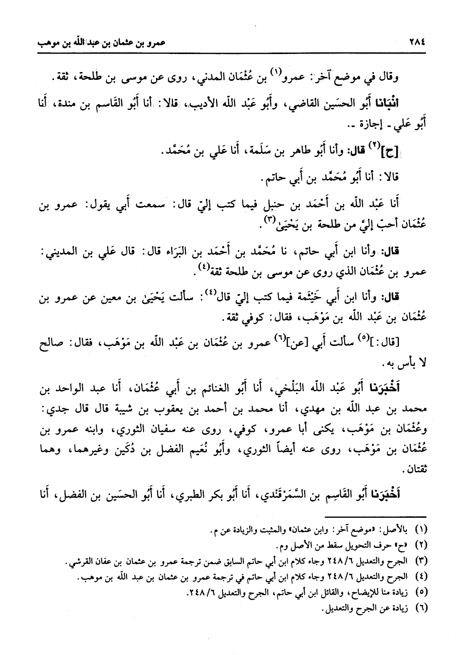 (4) الجرح والتعديل 6 / 248 وجاء كلام ابن أبي حاتم في ترجمة عمرو بن عثمان بن عبد الله بن موهب