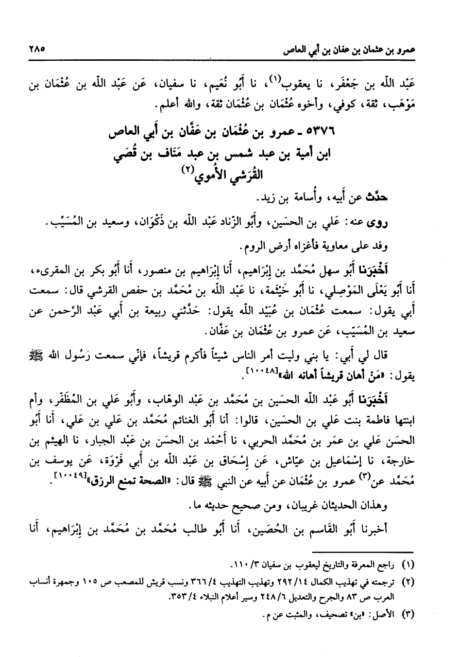 5376 - عمرو بن عثمان بن عفان بن أبي العاص بن أمية بن عبد شمس بن عبد مناف بن قصي القرشي الأموي (2) حدث عن أبيه وأسامة بن زيد روى عنه علي بن الحسين وأبو الزناد عبد الله بن ذكوان وسعيد بن المسيب وفد على معاوية فأغزاه أرض الروم أخبرنا أبو سهل محمد بن إبراهيم أنا إبراهيم بن منصور أنا أبو بكر بن المقرئ أنا أبو يعلى الموصلي نا أبو خيثمة نا عبد الله بن محمد بن حفص القرشي قال سمعت أبي يقول سمعت عثمان بن عبيد الله يقول حدثني ربيعة بن أبي عبد الرحمن عن سعيد بن المسيب عن عمرو بن عثمان بن عفان قال لي أبي يا بني وليت أمر الناس شيئا فأكرم قريشا فإني سمعت رسول الله (صلى الله عليه وسلم) يقول من أهان قريشا أهانه الله