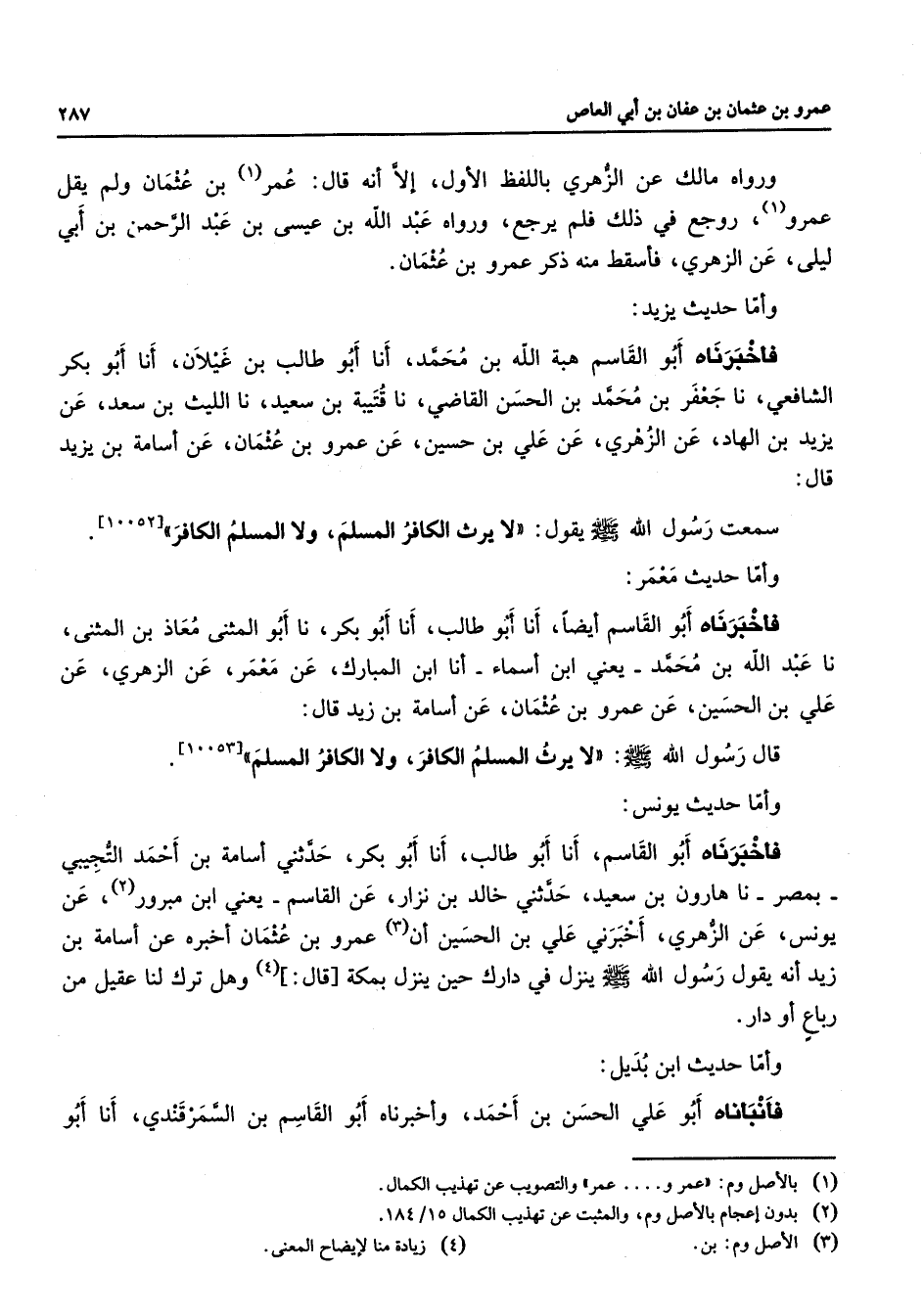 ورواه مالك عن الزهري باللفظ الأول إلا أنه قال عمر بن عثمان ولم يقل عمرو (1) روجع في ذلك فلم يرجع ورواه عبد الله بن عيسى بن عبد الرحمن بن أبي ليلى عن الزهري فأسقط منه ذكر عمرو بن عثمان وأما حديث يزيد فأخبرناه أبو القاسم هبة الله بن محمد أنا أبو طالب بن غيلان أنا أبو بكر الشافعي نا جعفر بن محمد بن الحسن القاضي نا قتيبة بن سعيد نا الليث بن سعد عن يزيد بن الهاد عن الزهري عن علي بن حسين عن عمرو بن عثمان عن أسامة بن يزيد قال سمعت رسول الله (صلى الله عليه وسلم) يقول لا يرث الكافر المسلم ولا المسلم الكافر