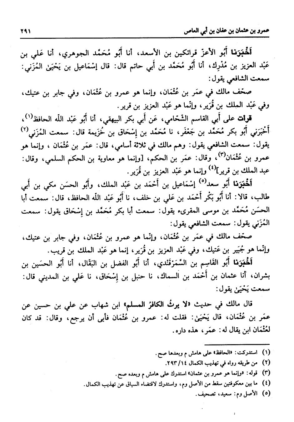 أخبرنا أبو الأعز قراتكين بن الأسعد أنا أبو محمد الجوهري أنا علي بن عبد العزيز بن مدرك أنا أبو محمد بن أبي حاتم قال قال إسماعيل بن يحيى المزني سمعت الشافعي يقول صحف مالك في عمر بن عثمان وإنما هو عمرو بن عثمان وفي جابر بن عتيك وفي عبد الملك بن قرير وإنما هو عبد العزيز بن قرير قرأت على أبي القاسم الشحامي عن أبي بكر البيهقي أنا أبو عبد الله الحافظ (1) أخبرني أبو بكر محمد بن جعفر نا محمد بن إسحاق بن خزيمة قال سمعت المزني (2) يقول سمعت الشافعي يقول وهم مالك في ثلاثة أسامي قال عمر بن عثمان وإنما هو عمرو بن عثمان (3) وقال عمر بن الحكم وإنما هو معاوية بن الحكم السلمي وقال عبد الملك بن قرير (4) وإنما هو عبد العزيز بن قرير أخبرنا أبو سعد (5) إسماعيل بن أحمد بن عبد الملك وأبو الحسن مكي بن أبي طالب قالا أنا أبو بكر أحمد بن علي بن خلف نا أبو عبد الله الحافظ قال سمعت أبا الحسن محمد بن موسى المقرئ يقول سمعت أبا بكر محمد بن إسحاق يقول سمعت المزني يقول سمعت الشافعي يقول صحف مالك في عمر بن عثمان وإنما هو عمرو بن عثمان وفي جابر بن عتيك وإنما هو جبير بن عتيك وفي عبد العزيز بن قرير إنما هو عبد الملك بن قريب أخبرنا أبو القاسم بن السمرقندي أنا أبو الفضل بن البقال أنا أبو الحسين ين بشران أنا عثمان بن أحمد بن السماك نا حنبل بن إسحاق نا علي بن المديني قال سمعت يحيى يقول قال مالك في حديث لا يرث الكافر المسلم ابن شهاب عن علي بن حسين عن عمر بن عثمان قال يحيى فقلت له عمرو بن عثمان فأبى أن يرجع وقال قد كان لعثمان ابن يقال له عمر هذه داره