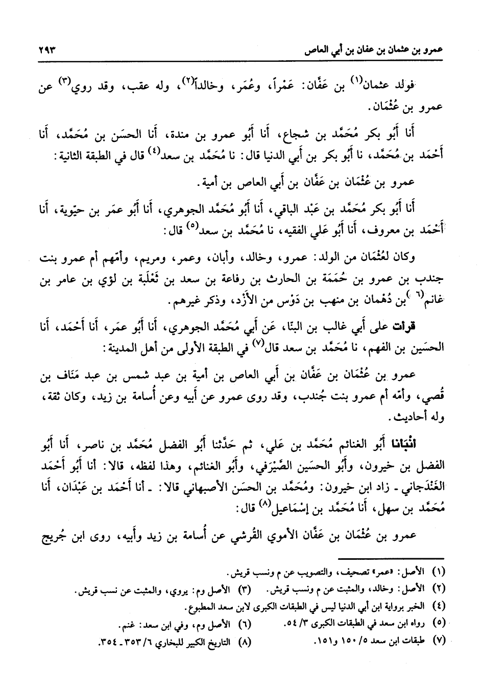 فولد عثمان (1) بن عفان عمرا وعمر وخالدا (2) وله عقب وقد روي (3) عن عمرو بن عثمان أنا أبو بكر محمد بن شجاع أنا أبو عمرو بن مندة أنا الحسن بن محمد أنا أحمد بن محمد نا أبو بكر بن أبي الدنيا قال نا محمد بن سعد (4) قال في الطبقة الثانية عمرو بن عثمان بن عفان بن أبي العاص بن أمية أنا أبو بكر محمد بن عبد الباقي أنا أبو محمد الجوهري أنا أبو عمر بن حيوية أنا أحمد بن معروف أنا أبو علي الفقيه نا محمد بن سعد (5) قال وكان لعثمان من الولد عمرو وخالد وأبان وعمر ومريم وأمهم أم عمرو بنت جندب بن عمرو بن حممة بن الحارث بن رفاعة بن سعد بن ثعلبة بن لؤي بن عامر بن غانم (6) بن دهمان بن منهب بن دوس من الازد وذكر غيرهم قرأت على أبي غالب بن البنا عن أبي محمد الجوهري أنا أبو عمر أنا أحمد أنا الحسين بن الفهم نا محمد بن سعد قال (7) في الطبقة الأولى من أهل المدينة عمرو بن عثمان بن عفان بن أبي العاص بن أمية بن عبد شمس بن عبد مناف بن قصي وأمه أم عمرو بنت جندب وقد روى عمرو عن أبيه وعن أسامة بن زيد وكان ثقة وله أحاديث أنبأنا أبو الغنائم محمد بن علي ثم حدثنا أبو الفضل محمد بن ناصر أنا أبو الفضل بن خيرون وأبو الحسين الصيرفي وأبو الغنائم وهذا لفظه قالا أنا أبو احمد الغندجاني زاد ابن خيرون ومحمد بن الحسن الاصبهاني قالا أنا أحمد بن عبدان أنا محمد بن سهل أنا محمد بن إسماعيل (8) قال عمرو بن عثمان بن عفان الأموي القرشي عن أسامة بن زيد وأبيه روى ابن جريج