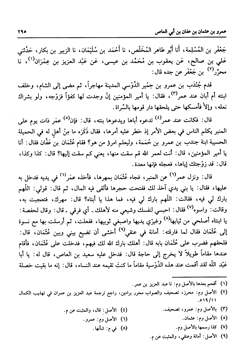 جعفر بن المسلمة أنا أبو طاهر المخلص نا أحمد بن سليمان نا الزبير بن بكار حدثني علي بن صالح عن يعقوب بن محمد بن عيسى عن عبد العزيز بن عمران (1) نا محرر (2) بن جعفر عن جده قال قدم جندب بن عمرو بن حمير الدوسي المدينة مهاجرا ثم مضى إلى الشام وخلف ابنته أم أبان عند عمر (3) فقال يا أمير المؤمنين إن وجدت لها كفؤا فزوجه ولو بشراك نعله وإلا فأمسكها حتى يلحقها دار قومها بالسراة قال فكانت عند عمر (4) تدعوه أباها ويدعوها بنته قال فإن (5) عمر ذات يوم على المنبر يكلم الناس في بعض الأمر إذ خطر عليه أمرها فقال ذكره ما من أهل له في الحميلة الحسيبة ابنة جندب بن عمرو بن حممة وليعلم امرؤ من هو فقام عثمان بن عفان فقال أنا يا أمير المؤمنين قال أنت لعمر الله قم سقت منها يعني كم سقت إليها قال كذا وكذا قال قد زوجتك إياها فعجله فإنها معدة قال ونزل عمر (6) عن المنبر فجاء عثمان بمهرها فأخذه عمر (6) في يديه فدخل به عليها فقال يا بني يدي آخذ لك ففتحت حجرلها فألقى فيه المال ثم قال قولي اللهم بارك لي فيه فقالت اللهم بارك لي فيه فما هذا يا أبتاه قال مهرك فتعجبت به وقالت واسوه (7) فقال احبسي لنفسك وشيعي منه لأهلك أي فرقي قال وقال لحفصة يا ابنتاه أصلحي من ثيابها (9) وغيري يديها واصبغي ثوبيها ففعلت ثم أرسلت بها مع نسوة إلى عثمان فقال لما فارقته أمانة في عنقي (9) أخشى أن تضيع بيني وبين عثمان قال فلحقهم فضرب على عثمان بابه قال أهلك بارك الله لك فيهم فدخلت على عثمان فأقام عندها مقاما طويلا لا يخرج إلى حاجة قال فدخل عليه سعيد بن العاص قال له يا أبا عبد الله لقد أقمت عند هذه الدوسية مقاما ما كنت تقيمه عند النساء قال إنه ما بقيت خصلة