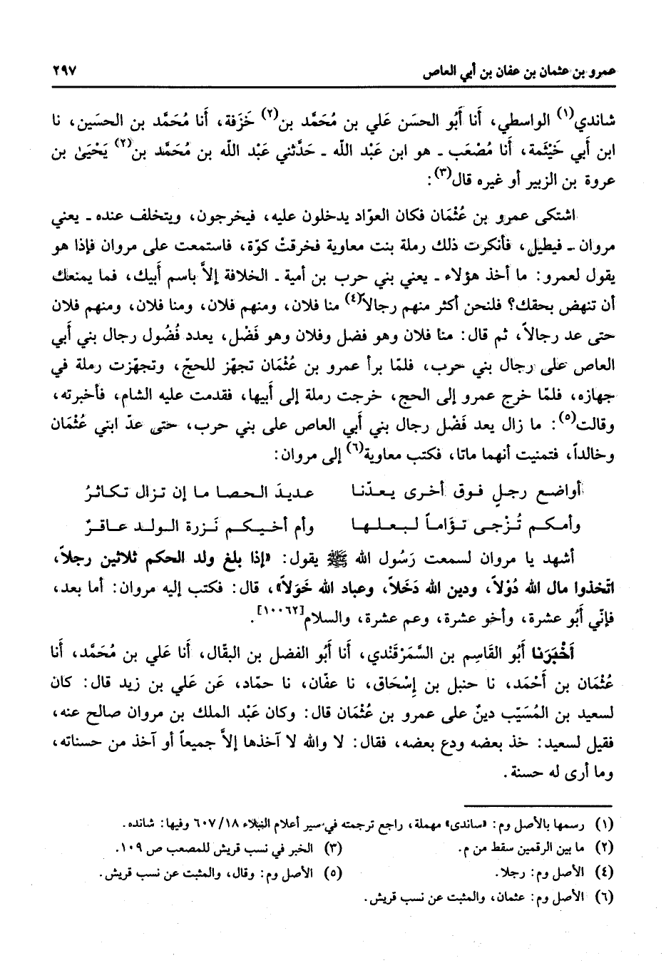 شاندي (1) الواسطي أنا أبو الحسن علي بن محمد بن (2) خزفة أنا محمد بن الحسين نا ابن أبي خيثمة أنا مصعب هو ابن عبد الله حدثني عبد الله بن محمد بن يحيى بن عروة بن الزبير أو غيره قال (3) اشتكى عمرو بن عثمان فكان العواد يدخلون عليه فيخرجون ويتخلف عنده يعني مروان فيطيل فأنكرت ذلك رملة بنت معاوية فخرقت كوة فاستمعت على مروان فإذا هو يقول لعمرو ما أخذ هؤلاء يعني بني حرب بن أمية الخلافة إلا باسم أبيك فما يمنعك أن تنهض بحقك فلنحن أكثر منهم رجالا (4) منا فلان ومنهم فلان ومنا فلان ومنهم فلان حتى عد رجالا ثم قال منا فلان وهو فضل وفلان وهو فضل يعدد فضول رجال بني أبي العاص على رجال بني حرب فلما برأ عمرو بن عثمان تجهز للحج وتجهزت رملة في جهازه فلما خرج عمرو إلى الحج خرجت رملة إلى أبيها فقدمت عليه الشام فأخبرته وقالت (5) ما زال يعد فضل رجال بني أبي العاص على بني حرب حتى عد ابني عثمان وخالدا فتمنيت أنهما ماتا فكتب معاوية (6) إلى مروان * أواضع رجل فوق أخرى يعدنا * عديد الحصا ما إن تزال تكاثر وأمكم تزجى تؤاما لبعلها * وأم أخيكم نزرة الولد عاقر * أشهد يا مروان لسمعت رسول الله (صلى الله عليه وسلم) يقول إذا بلغ ولد الحكم ثلاثين رجلا اتخذوا مال الله دولا ودين الله دخلا وعباد الله خولا قال فكتب إليه مروان أما بعد فإني أبو عشرة وأخو عشرة وعم عشرة والسلام