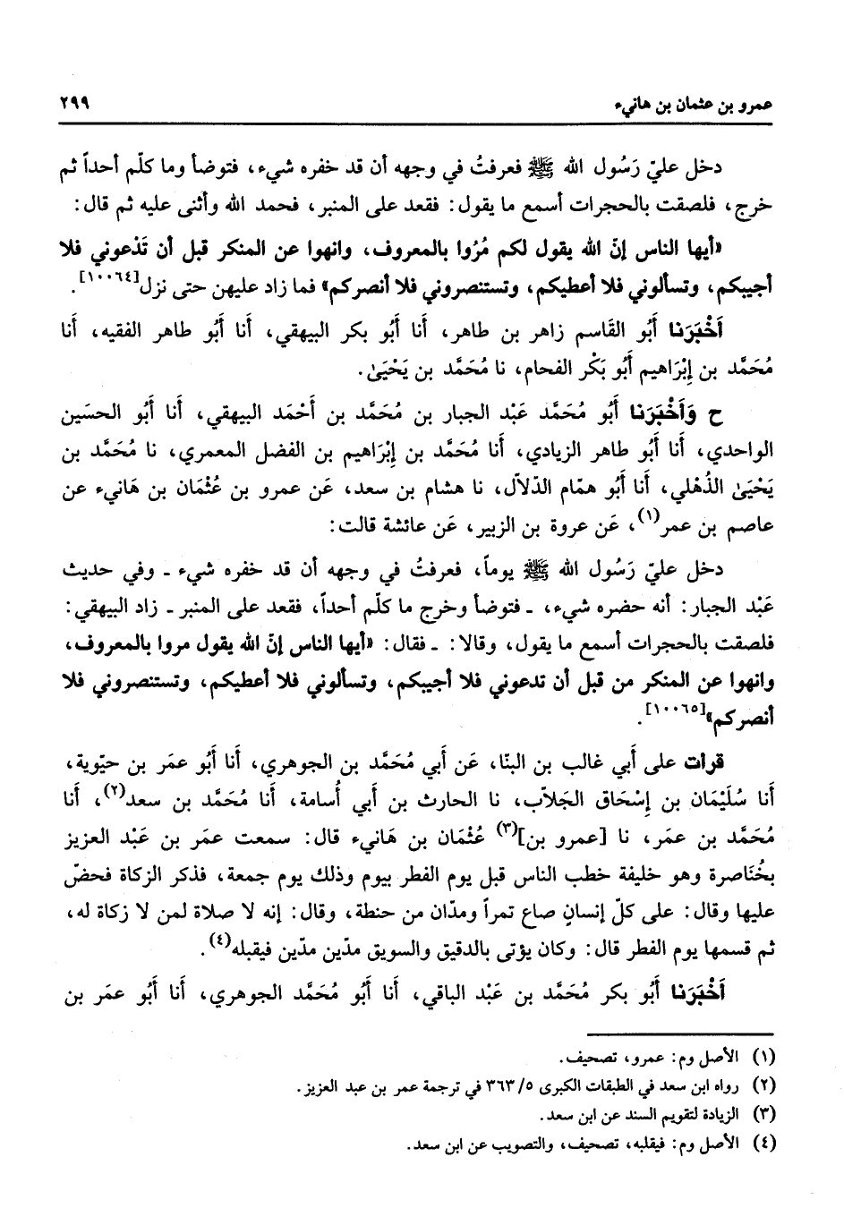 [10064] أخبرنا أبو القاسم زاهر بن طاهر أنا أبو بكر البيهقي أنا أبو طاهر الفقيه أنا محمد بن إبراهيم أبو بكر الفحام نا محمد بن يحيى ح وأخبرنا أبو محمد عبد الجبار بن محمد بن أحمد البيهقي أنا أبو الحسين الواحدي أنا أبو طاهر الزيادي أنا محمد بن إبراهيم بن الفضل المعمري نا محمد بن يحيى الذهلي أنا أبو همام الدلال نا هشام بن سعد عن عمرو بن عثمان بن هانئ عن عاصم بن عمر (1) عن عروة بن الزبير عن عائشة قالت دخل علي رسول الله (صلى الله عليه وسلم) يوما فعرفت في وجهه أن قد خفره شئ وفي حديث عبد الجبار أنه حضره شئ فتوضأ وخرج ما كلم أحدا فقعد على المنبر زاد البيهقي فلصقت بالحجرات أسمع ما يقول وقالا فقال أيها الناس إن الله يقول مروا بالمعروف وانهوا عن المنكر من قبل أن تدعوني فلا أجيبكم وتسألوني فلا أعطيكم وتستنصروني فلا أنصركم