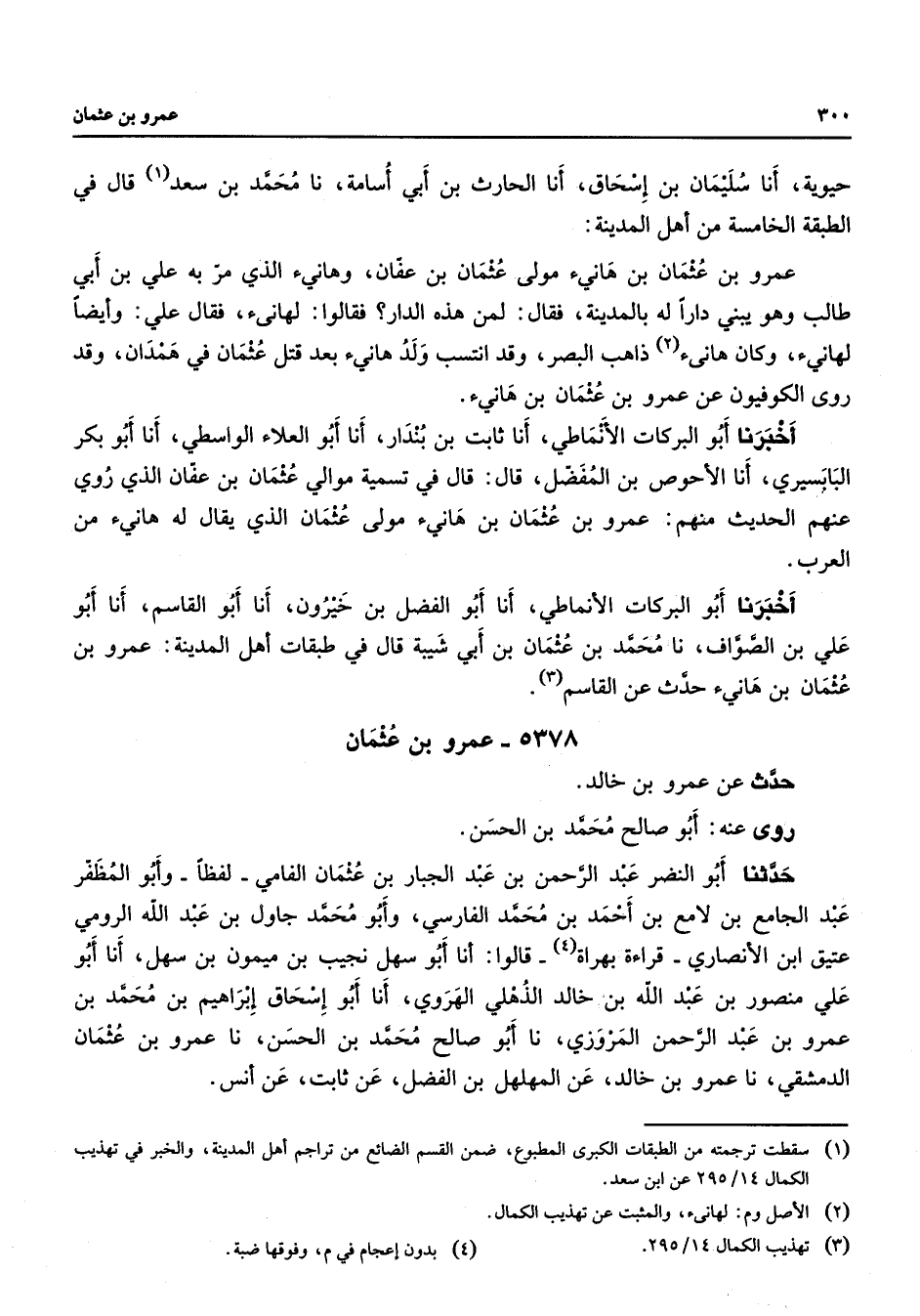 حيوية أنا سليمان بن إسحاق أنا الحارث بن أبي أسامة نا محمد بن سعد قال في الطبقة الخامسة من أهل المدينة عمرو بن عثمان بن هانئ مولى عثمان بن عفان وهانئ الذي مر به علي بن أبي طالب وهو يبني دارا له بالمدينة فقال لمن هذه الدار فقالوا لهانئ فقال علي وأيضا لهانئ وكان هانئ (2) ذاهب البصر وقد انتسب ولد هانئ بعد قتل عثمان في همدان وقد روى الكوفيون عن عمرو بن عثمان بن هانئ أخبرنا أبو البركات الأنماطي أنا ثابت بن بندار أنا أبو العلاء الواسطي أنا أبو بكر البابسيري أنا الأحوص بن المفضل قال قال في تسمية موالي عثمان بن عفان الذي روي عنهم الحديث منهم عمرو بن عثمان بن هانئ مولى عثمان الذي يقال له هانئ من العرب أخبرنا أبو البركات الأنماطي أنا أبو الفضل بن خيرون أنا أبو القاسم أنا أبو علي بن الصواف نا محمد بن عثمان بن أبي شيبة قال في طبقات أهل المدينة عمرو بن عثمان بن هانئ حدث عن القاسم (3) 5387 عمرو بن عثمان حدث عن عمرو بن خالد روى عنه أبو صالح محمد بن الحسن حدثنا أبو النضر عبد الرحمن بن عبد الجبار بن عثمان الفامي لفظا وأبو المظفر عبد الجامع بن لامع بن أحمد بن محمد الفارسي وأبو محمد جاول بن عبد الله الرومي عتيق ابن الأنصاري قراءة بهراة (4) قالوا أنا أبو سهل نجيب بن ميمون بن سهل أنا أبو علي منصور بن عبد الله بن خالد الذهلي الهروي أنا أبو إسحاق إبراهيم بن محمد بن عمرو بن عبد الرحمن المروزي نا أبو صالح محمد بن الحسن نا عمرو بن عثمان الدمشقي نا عمرو بن خالد عن المهلهل بن الفضل عن ثابت عن أنس