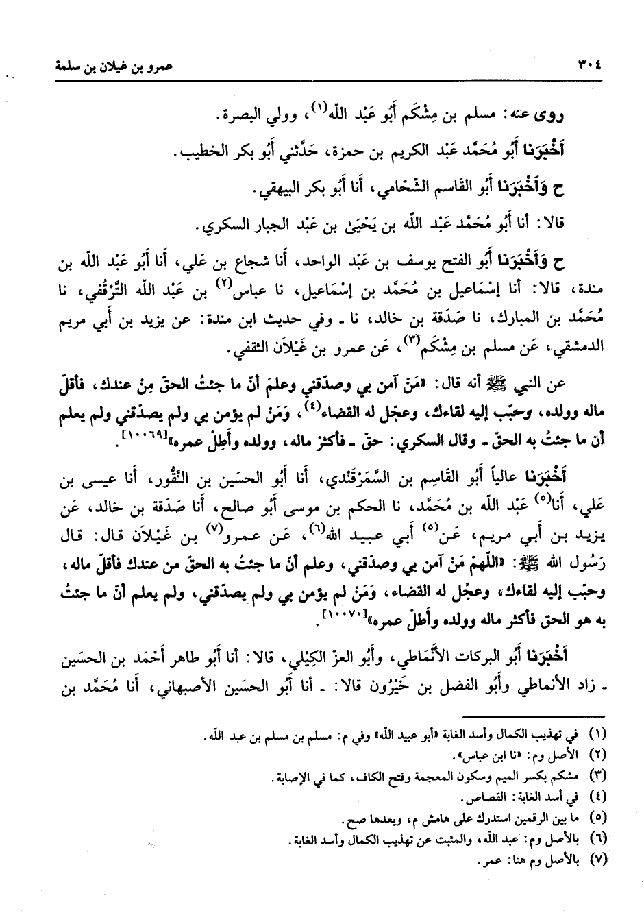 روى عنه مسلم بن مشكم أبو عبد الله (1) وولي البصرة أخبرنا أبو محمد عبد الكريم بن حمزة حدثني أبو بكر الخطيب ح وأخبرنا أبو القاسم الشحامي أنا أبو بكر البيهقي قالا أنا أبو محمد عبد الله بن يحيى بن عبد الجبار السكري ح وأخبرنا أبو الفتح يوسف بن عبد الواحد أنا شجاع بن علي أنا أبو عبد الله بن مندة قالا أنا إسماعيل بن محمد بن إسماعيل نا عباس (2) بن عبد الله الترقفي نا محمد بن المبارك نا صدقة بن خالد نا وفي حديث ابن مندة عن يزيد بن أبي مريم الدمشقي عن مسلم بن مشكم (3) عن عمرو بن غيلان الثقفي عن النبي (صلى الله عليه وسلم) أنه قال من آمن بي وصدقني وعلم أن ما جئت الحق من عندك فأقل ماله وولده وحبب إليه لقاءك وعجل له القضاء (4) ومن لم يؤمن بي ولم يصدقني ولم يعلم أن ما جئت به الحق وقال السكري حق فأكثر ماله وولده وأطل عمره