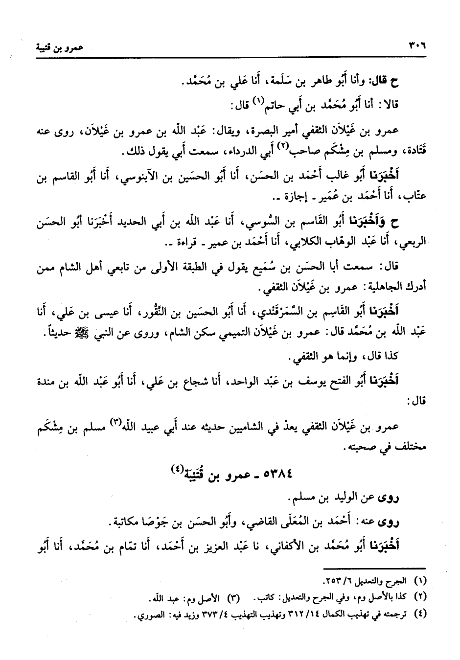 ح قال وأنا أبو طاهر بن سلمة أنا علي بن محمد قالا أنا أبو محمد بن أبي حاتم (1) قال عمرو بن غيلان الثقفي أمير البصرة ويقال عبد الله بن عمرو بن غيلان روى عنه قتادة ومسلم بن مشكم صاحب (2) أبي الدرداء سمعت أبي يقول ذلك أخبرنا أبو غالب أحمد بن الحسن أنا أبو الحسين بن الآبنوسي أنا أبو القاسم بن عتاب أنا أحمد بن عمير إجازة ح وأخبرنا أبو القاسم بن السوسي أنا عبد الله بن أبي الحديد أخبرنا أبو الحسن الربعي أنا عبد الوهاب الكلابي أنا أحمد بن عمير قراءة قال سمعت أبا الحسن بن سميع يقول في الطبقة الأولى من تابعي أهل الشام ممن أدرك الجاهلية عمرو بن غيلان الثقفي أخبرنا أبو القاسم بن السمرقندي أنا أبو الحسين بن النقور أنا عيسى بن علي أنا عبد الله بن محمد قال عمرو بن غيلان التميمي سكن الشام وروى عن النبي (صلى الله عليه وسلم) حديثا كذا قال وإنما هو الثقفي أخبرنا أبو الفتح يوسف بن عبد الواحد أنا شجاع بن علي أنا أبو عبد الله بن مندة قال عمرو بن غيلان الثقفي يعد في الشاميين حديثه عند أبي عبيد الله (3) مسلم بن مشكم مختلف في صحبته