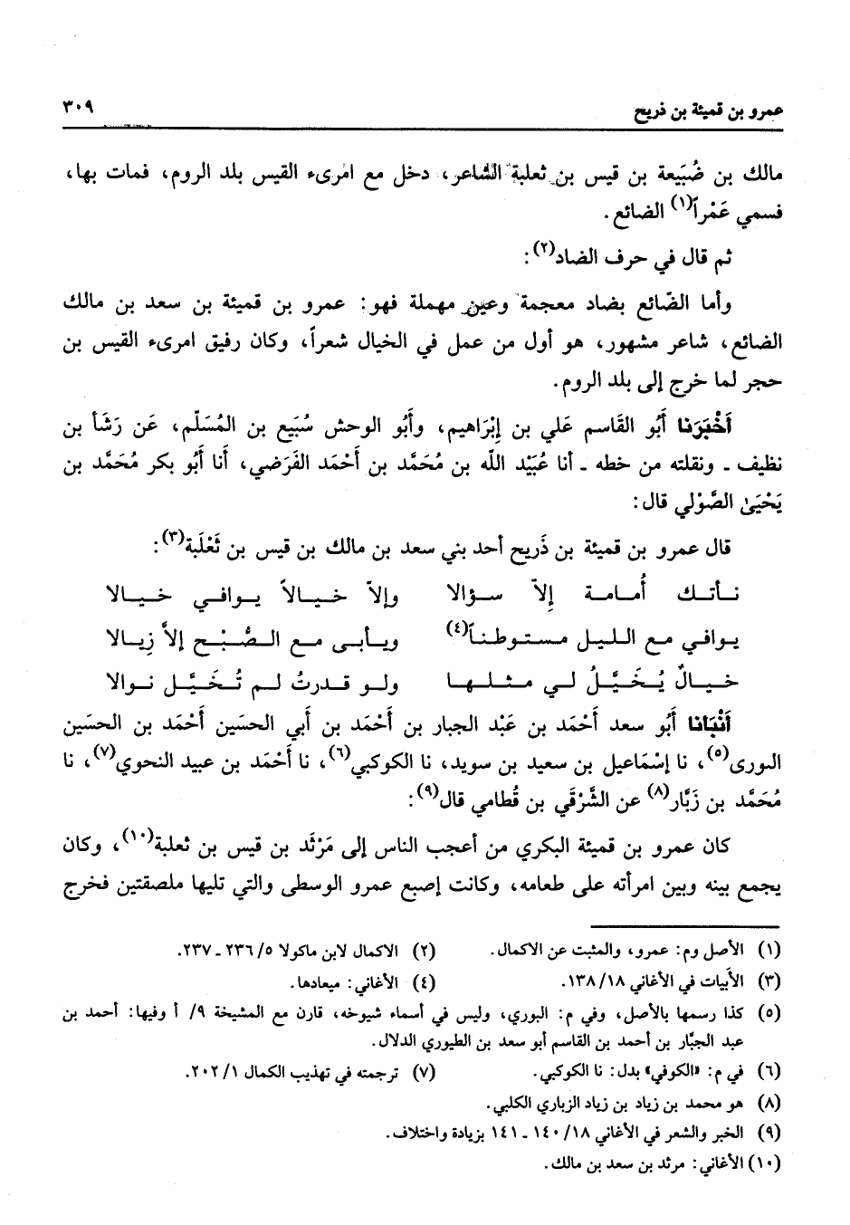 مالك بن ضبيعة بن قيس بن ثعلبة الشاعر دخل مع امرئ القيس بلد الروم فمات بها فسمي عمرا الضائع (1) ثم قال في حرف الضاد (2) وأما الضائع بضاد معجمة وعين مهملة فهو عمرو بن قميئة بن سعد بن مالك الضائع شاعر مشهور هو أول من عمل في الخيال شعرا وكان رفيق امرئ القيس بن حجر لما خرج إلى بلد الروم أخبرنا أبو القاسم علي بن إبراهيم وأبو الوحش سبيع بن المسلم عن رشأ بن نظيف ونقلته من خطه أنا عبيد الله بن محمد بن أحمد الفرضي أنا أبو بكر محمد بن يحيى الصولي قال قال عمرو بن قميئة بن ذريح أحد بني سعد بن مالك بن قيس بن ثعلبة (3) * نأتك أمامة إلا سؤالا * وإلا خيالا يوافي خيالا يوافي مع الليل مستوطنا (4) * ويأبى مع الصبح إلا زيالا خيال يخيل لي مثلها * ولو قدرت لم تخيل نوالا * أنبأنا أبو سعد أحمد بن عبد الجبار بن أحمد بن أبي الحسين أحمد بن الحسين البوري (5) نا إسماعيل بن سعيد بن سويد نا الكوكبي (6) نا أحمد بن عبيد النحوي (7) نا محمد بن زبار (8) عن الشرقي بن قطامي قال (9) كان عمرو بن قميئة البكري من أعجب الناس إلى مرثد بن قيس بن ثعلبة (10) وكان يجمع بينه وبين امرأته على طعامه وكانت إصبع عمرو الوسطى والتي تليها ملصقتين فخرج