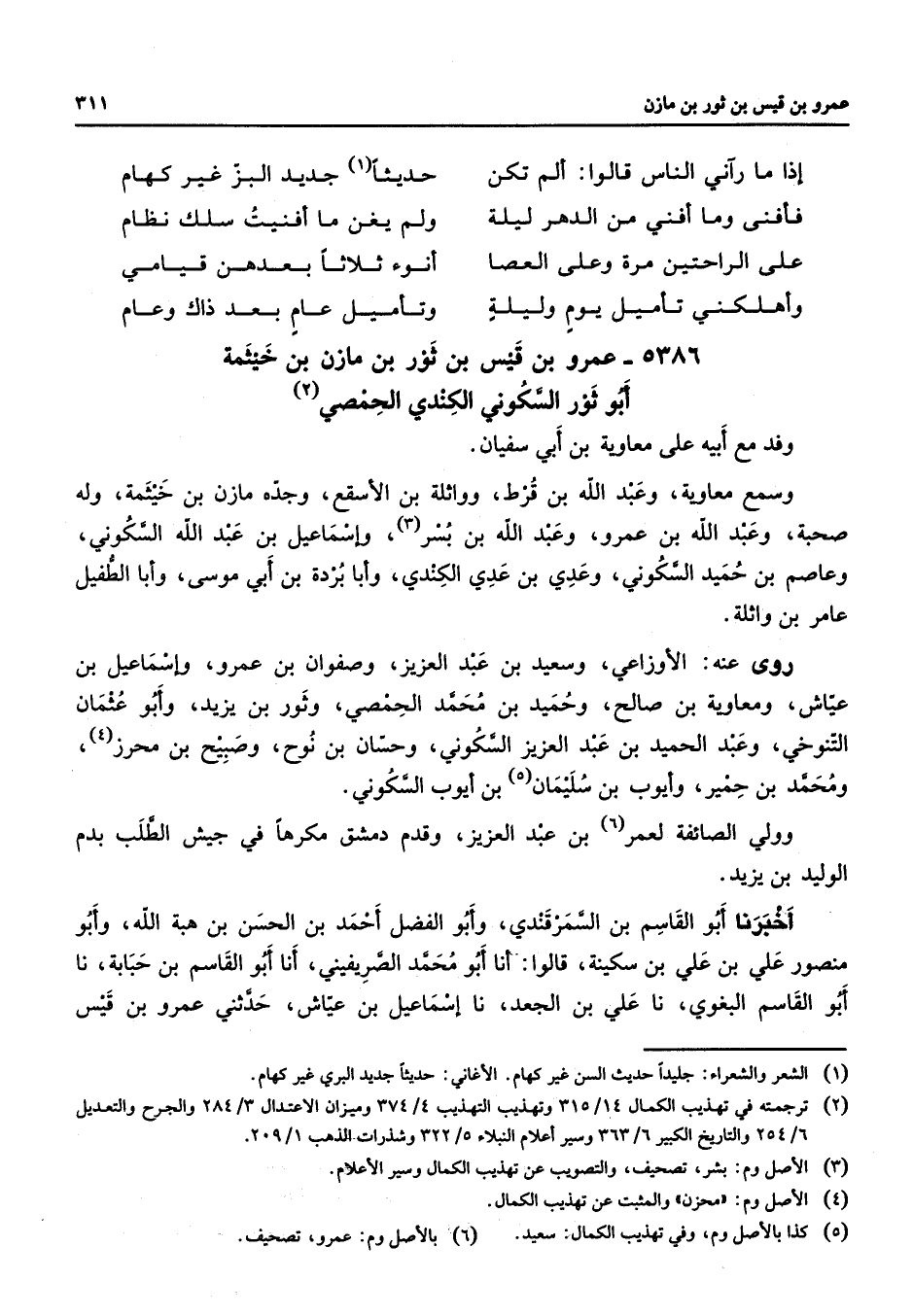 5386 - عمرو بن قيس بن ثور بن مازن بن خيثمة أبو ثور السكوني الكندي الحمصي (2) وفد مع أبيه على معاوية بن أبي سفيان وسمع معاوية وعبد الله بن قرط وواثلة بن الأسقع وجده مازن بن خيثمة وله صحبة وعبد الله بن عمرو وعبد الله بن بسر (3) وإسماعيل بن عبد الله السكوني وعاصم بن حميد السكوني وعدي بن عدي الكندي وأبا بردة بن أبي موسى وأبا الطفيل عامر بن واثلة روى عنه الأوزاعي وسعيد بن عبد العزيز وصفوان بن عمرو وإسماعيل بن عياش ومعاوية بن صالح وحميد بن محمد الحمصي وثور بن يزيد وأبو عثمان التنوخي وعبد الحميد بن عبد العزيز السكوني وحسان بن نوح وصبيح بن محرز (4) ومحمد بن حمير وأيوب بن سليمان (5) بن أيوب السكوني وولي الصائفة لعمر (6) بن عبد العزيز وقدم دمشق مكرها في جيش الطلب بدم الوليد بن يزيد أخبرنا أبو القاسم بن السمرقندي وأبو الفضل أحمد بن الحسن بن هبة الله وأبو منصور علي بن علي بن سكينة قالوا أنا أبو محمد الصريفيني أنا أبو القاسم بن حبابة نا أبو القاسم البغوي نا علي بن الجعد نا إسماعيل بن عياش حدثني عمرو بن قيس