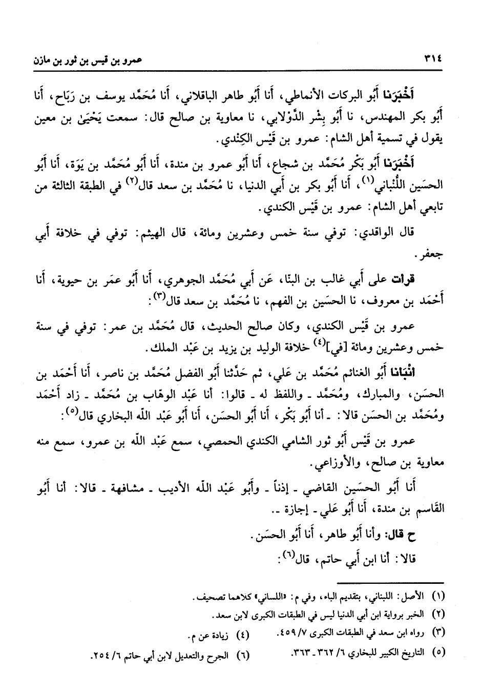 أخبرنا أبو البركات الأنماطي أنا أبو طاهر الباقلاني أنا محمد يوسف بن رباح أنا أبو بكر المهندس نا أبو بشر الدولابي نا معاوية بن صالح قال سمعت يحيى بن معين يقول في تسمية أهل الشام عمرو بن قيس الكندي أخبرنا أبو بكر محمد بن شجاع أنا أبو عمرو بن مندة أنا أبو محمد بن يوة أنا أبو الحسين اللنباني (1) أنا أبو بكر بن أبي الدنيا نا محمد بن سعد قال (2) في الطبقة الثالثة من تابعي أهل الشام عمرو بن قيس الكندي قال الواقدي توفي سنة خمس وعشرين ومائة قال الهيثم توفي في خلافة أبي جعفر قرأت على أبي غالب بن البنا عن أبي محمد الجوهر يأنا أبو عمر بن حيوية أنا أحمد بن معروف نا الحسين بن الفهم نا محمد بن سعد قال (3) عمرو بن قيس الكندي وكان صالح الحديث قال محمد بن عمر توفي في سنة خمس وعشرين ومائة [في] (4) خلافة الوليد بن يزيد بن عبد الملك أنبأنا أبو الغنائم محمد بن علي ثم حدثنا أبو الفضل محمد بن ناصر أنا أحمد بن الحسن والمبارك ومحمد واللفظ له قالوا أنا عبد الوهاب بن محمد زاد أحمد ومحمد بن الحسن قالا أنا أبو بكر أنا أبو الحسن أنا أبو عبد الله البخاري قال (5) عمرو بن قيس أبو ثور الشامي الكندي الحمصي سمع عبد الله بن عمرو سمع منه معاوية بن صالح والأوزاعي أنا أبو الحسين القاضي إذنا وأبو عبد الله الأديب مشافهة قالا أنا أبو القاسم بن مندة أنا أبو علي إجازة ح قال وأنا أبو طاهر أنا أبو الحسن قالا أنا ابن أبي حاتم قال (6)