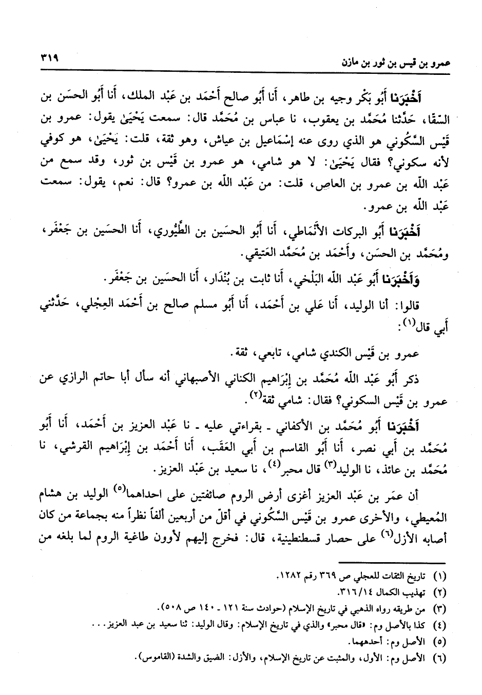 أخبرنا أبو بكر وجيه بن طاهر أنا أبو صالح أحمد بن عبد الملك أنا أبو الحسن بن السقا حدثنا محمد بن يعقوب نا عباس بن محمد قال سمعت يحيى يقول عمرو بن قيس السكوني هو الذي روى عنه إسماعيل بن عياش وهو ثقة قلت يحيى هو كوفي لأنه سكوني فقال يحيى لا هو شامي هو عمرو بن قيس بن ثور وقد سمع من عبد الله بن عمرو بن العاص قلت من عبد الله بن عمرو قال نعم يقول سمعت عبد الله بن عمرو أخبرنا أبو البركات الأنماطي أنا أبو الحسين بن الطيوري أنا الحسين بن جعفر ومحمد بن الحسن وأحمد بن محمد العتيقي وأخبرنا أبو عبد الله البلخي أنا ثابت بن بندار أنا الحسين بن جعفر قالوا أنا الوليد أنا علي بن أحمد أنا أبو مسلم صالح بن أحمد العجلي حدثني أبي قال (1) عمرو بن قيس الكندي شامي تابعي ثقة ذكر أبو عبد الله محمد بن إبراهيم الكناني الأصبهاني أنه سأل أبا حاتم الرازي عن عمرو بن قيس السكوني فقال شامي ثقة (2) أخبرنا أبو محمد بن الأكفاني بقراءتي عليه نا عبد العزيز بن أحمد أنا أبو محمد بن أبي نصر أنا أبو القاسم بن أبي العقب أنا أحمد بن إبراهيم القرشي نا محمد بن عائذ نا الوليد (3) قال محبر (4) نا سعيد بن عبد العزيز أن عمر بن عبد العزيز أغزى أرض الروم صائفتين على إحداهما (5) الوليد بن هشام المعيطي والأخرى عمرو بن قيس السكوني في أقل من أربعين ألفا نظرا منه بجماعة من كان أصابه الأزل (6) على حصار قسطنطينية قال فخرج إليهم لأوون طاغية الروم لما بلغه من
