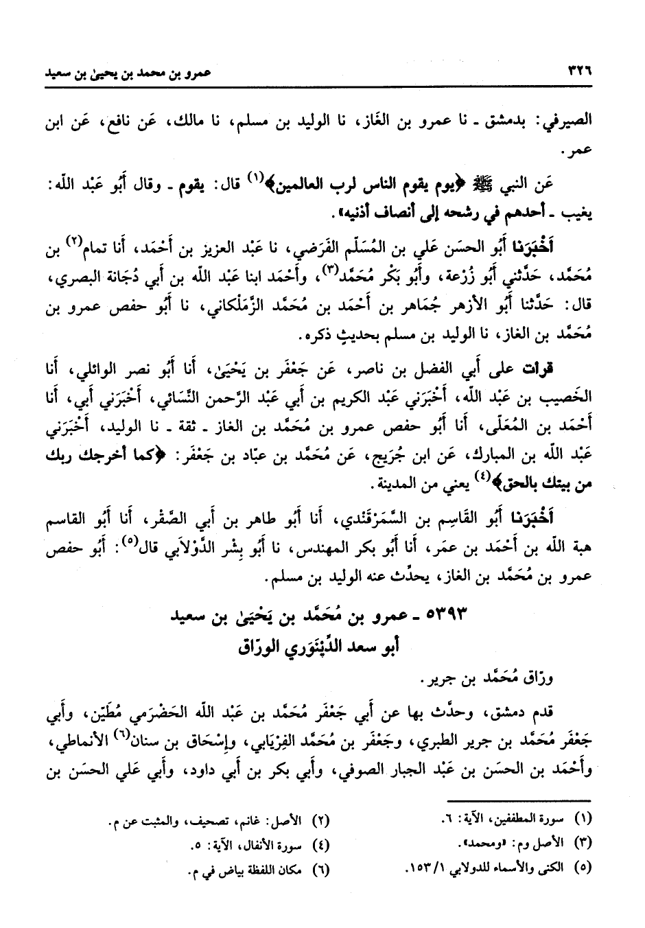 الصيرفي بدمشق نا عمرو بن الغاز نا الوليد بن مسلم نا مالك عن نافع عن ابن عمر عن النبي صلى الله عليه وسلم " يوم يقوم الناس لرب العالمين " (1) قال يقوم وقال أبو عبد الله يغيب أحدهم في رشحه إلى أنصاف أذنيه أخبرنا أبو الحسن علي بن المسلم الفرضي نا عبد العزيز بن أحمد أنا تمام (2) بن محمد حدثني أبو زرعة وأبو بكر محمد (3) وأحمد ابنا عبد الله بن أبي دجانة البصري قال حدثنا أبو الأزهر جماهر بن أحمد بن محمد الزملكاني نا أبو حفص عمرو بن محمد بن الغاز نا الوليد بن مسلم بحديث ذكره قرأت على أبي الفضل بن ناصر عن جعفر بن يحيى أنا أبو نصر الوائلي أنا الخصيب بن عبد الله أخبرني عبد الكريم بن أبي عبد الرحمن النسائي أخبرني أبي أنا أحمد بن المعلى أنا أبو حفص عمرو بن محمد بن الغاز ثقة نا الوليد أخبرني عبد الله بن المبارك عن ابن جريج عن محمد بن عباد بن جعفر " كما أخرجك ربك من بيتك بالحق " (4) يعني من المدينة أخبرنا أبو القاسم بن السمرقندي أنا أبو طاهر بن أبي الصقر أنا أبو القاسم هبة الله بن أحمد بن عمر أنا أبو بكر المهندس نا أبو بشر الدولابي قال (5) أبو حفص عمرو بن محمد بن الغاز يحدث عنه الوليد بن مسلم