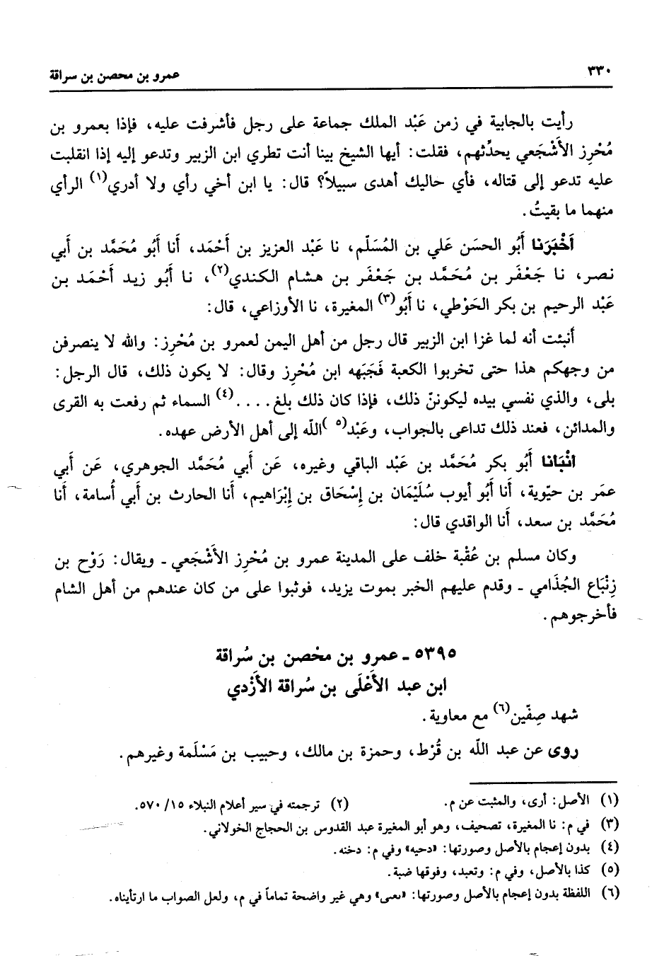 5395 - عمرو بن محصن بن سراقة بن عبد الأعلى بن سراقة الأزدي شهد صفين (6) مع معاوية روى عن عبد الله بن قرط وحمزة بن مالك وحبيب بن مسلمة وغيرهم