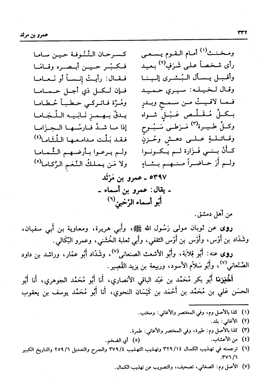 5397 - عمرو بن مرثد يقال عمرو بن أسماء أبو أسماء الحربي (6) من أهل دمشق روى عن ثوبان مولى رسول الله (صلى الله عليه وسلم) وأبي هريرة ومعاوية بن أبي سفيان وشداد بن أوس وأوس بن أوس الثقفي وأبي ثعلبة الخشني وعمرو البكالي روى عنه أبو قلابة وأبو الأشعث الصنعاني (7) وشداد أبو عمار وراشد بن داود الصنعاني (7) وأبو سلام الأسود وربيعة بن يزيد القصير أخبرنا أبو بكر محمد بن عبد الباقي الأنصاري أنا أبو محمد الجوهري أنا أبو الحسن علي بن محمد بن أحمد بن كيسان النحوي أنا أبو محمد يوسف بن يعقوب
