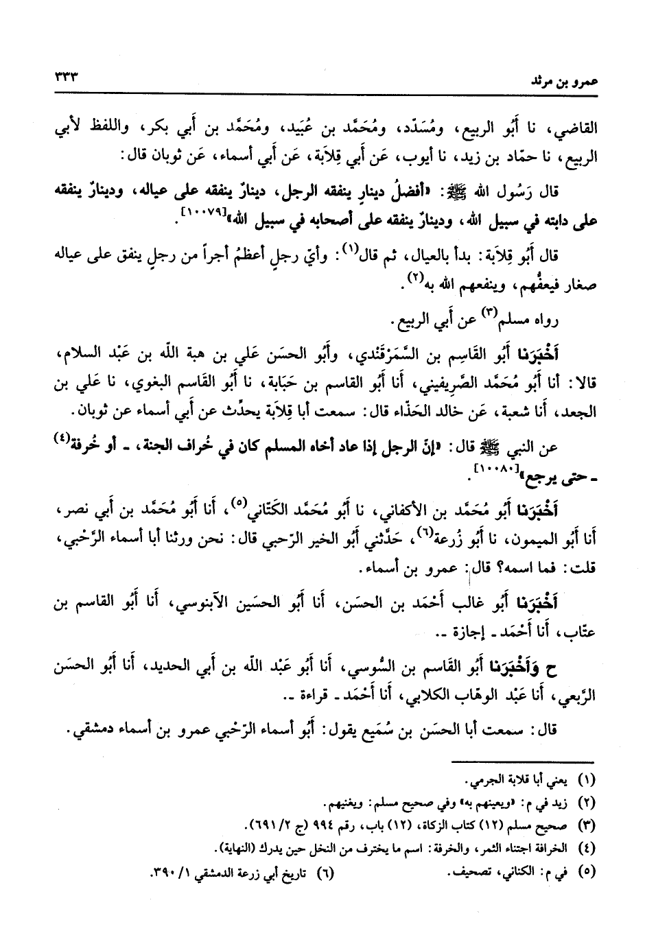 [10079] قال أبو قلابة بدأ بالعيال ثم قال (1) وأي رجل أعظم أجرا من رجل ينفق على عياله صغار فيعفهم وينفعهم الله به (2) رواه مسلم (3) عن أبي الربيع أخبرنا أبو القاسم بن السمرقندي وأبو الحسن علي بن هبة الله بن عبد السلام قالا أنا أبو محمد الصريفيني أنا أبو القاسم بن حبابة نا أبو القاسم البغوي نا علي بن الجعد أنا شعبة عن خالد الحذاء قال سمعت أبا قلابة يحدث عن أبي أسماء عن ثوبان عن النبي (صلى الله عليه وسلم) قال إن الرجل إذا عاد أخاه المسلم كان في خراف الجنة أو خرفة (4) حتى يرجع