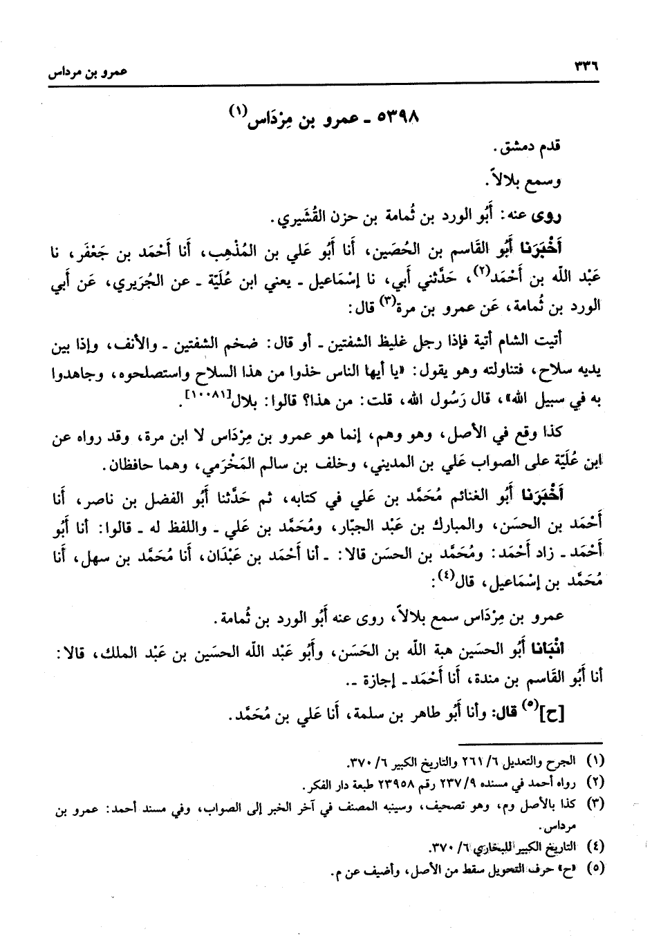 5398 - عمرو بن مرداس (1) قدم دمشق وسمع بلالا روى عنه أبو الورد بن ثمامة بن حزم القشيري أخبرنا أبو القاسم بن الحصين أنا أبو علي بن المذهب أنا أحمد بن جعفر نا عبد الله بن أحمد (2) حدثني أبي نا إسماعيل يعني ابن علية عن الجريري عن أبي الورد بن ثمامة عن عمرو بن مرة (3) قال أتيت الشام أتية فإذا رجل غليظ الشفتين أو قال ضحم الشفتين والأنف وإذا بين يديه سلاح فتناولته وهو يقول يا أيها الناس خذوا من هذا السلاح واستصلحوه وجاهدوا به في سبيل الله قال رسول الله قلت من هذا قالوا بلال