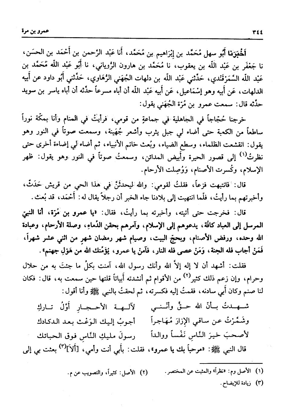 أخبرنا أبو سهل محمد بن إبراهيم بن محمد أنا عبد الرحمن بن أحمد بن الحسن نا جعفر بن عبد الله بن يعقوب نا محمد بن هارون الروياني نا أبو عبد الله محمد بن عبد الله السمرقندي حدثني عبد الله بن دلهات الجهني الرهاوي حدثني أبو داود عن أبيه الدلهات عن أبيه وهو إسماعيل عن أبيه عبد الله أن أباه مسرعا حدثه أن أباه ياسر بن سويد حدثه قال سمعت عمرو بن مرة الجهني يقول خرجنا حجاجا في الجاهلية في جماعة من قومي فرأيت في المنام وأنا بمكة نورا ساطعا من الكعبة حتى أضاء لي جبل يثرب وأشعر جهينة وسمعت صوتا في النور وهو يقول انقشعت الظلماء وسطع الضياء وبعث خاتم الأنبياء ثم أضاء لي إضاءة أخرى حتى نظرت (1) إلى قصور الحيرة وأبيض المدائن وسمعت صوتا في النور وهو يقول ظهر الإسلام وكسرت الأصنام وصلت الأرحام قال فانتبهت فزعا فقلت لقومي والله ليحدثن في هذا الحي من قريش حدث وأخبرتهم بما رأيت فلما انتهيت إلى بلادنا جاء الخبر أن رجلا يقال له أحمد قد بعث قال فخرجت حتى أتيته وأخبرته بما رأيت فقال يا عمرو بن مرة أنا النبي المرسل إلى العباد كافة يدعوهم إلى الإسلام وآمرهم بحقن الدماء وصلة الأرحام وعبادة الله وحده ورفض الأصنام وبحج البيت وصيام شهر رمضان شهر من اثني عشر شهرا فمن أجاب فله الجنة ومن عصى فله النار فآمن يا عمرو يؤمنك الله من هول جهنم فقلت أشهد أن لا إله إلا الله وأنك رسول الله آمنت بكل ما جئت به من حلال وحرام وإن زعم ذلك كثير (2) من الأقوام ثم أنشدته أبياتا قلتها حين سمعت به قال فكان لنا صنم وكان أبي سادنه فقمت إليه فكسرته ثم لحقت بالنبي (صلى الله عليه وسلم) وأنا أقول * شهدت بأن الله حق وأنني * لآلهة الأحجار أول تارك وشمرت عن ساقي الإزار مهاجرا * أجوب إليك الوعث بعد الدكادك لأصحب خير الناس نفسا ووالدا * رسول مليك الناس فوق الحبائك * قال النبي (صلى الله عليه وسلم) مرحبا بك يا عمرو فقلت بأبي أنت وأمي [ألا] (3) بعثت بي إلى