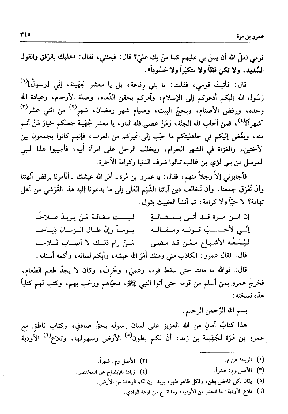 قومي لعل الله أن يمن بي عليهم كما من بك علي قال فبعثني فقال عليك بالرفق والقول السديد ولا تكن فظا ولا متكبرا ولا حسودا قال فأتيت قومي فقلت يا بني رفاعة بل يا معشر جهينة إني [رسول] (1) رسول الله إليك أدعوكم إلى الإسلام وآمركم بحقن الدماء وصلة الأرحام وعبادة الله وحده ورفض الأصنام وبحج البيت وصيام شهر رمضان شهر (2) من اثني عشر (3) شهرا (4) فمن أجاب فله الجنة ومن عصى فله النار يا معشر جهينة جعلكم خيار من أنتم منه وبغض إليكم في جاهليتكم ما حبب إلى غيركم من العرب فإنهم كانوا يجمعون بين الأختين والغزاة في الشهر الحرام ويخلف الرجل على امرأة أبيه فأجيبوا هذا النبي المرسل من بني لؤي بن غالب تنالوا شرف الدنيا وكرامة الآخرة فأجابوني إلا رجلا منهم فقال يا عمرو بن مرة أمر الله عيشك أتأمرنا برفض آلهتنا وأن نفرق جمعنا وأن نخالف دين آبائنا الشيم العلى إلى ما يدعونا إليه هذا القرشي من أهل تهامة لا حبا ولا كرامة ثم أنشأ الخبيث يقول * إن ابن مرة قد أتى بمقالة * ليست مقالة من يريد صلاحا إني لأحسب قوله ومقاله * يوما وإن طال الزمان ذباحا ليسفه الأشياخ ممن قد مضى * من رام ذلك لا أصاب فلاحا * قال فقال عمرو الكاذب مني ومنك أمر الله عيشه وأبكم لسانه وأكمه أسنانه قال فوالله ما مات حتى سقط فوه وعمي وخرف وكان لا يجد طعم الطعام فخرج عمرو بمن أسلم من قومه حتى أتوا النبي (صلى الله عليه وسلم) فحياهم ورحب بهم وكتب لهم كتابا هذه نسخته بسم الله الرحمن الرحيم هذا كتاب أمان من الله العزيز على لسان رسوله بحق صداق وكتاب ناطق مع عمرو بن مرة لجهينة بن زيد أن لكم بطون (5) الأرض وسهولها وتلاع (6) الأودية