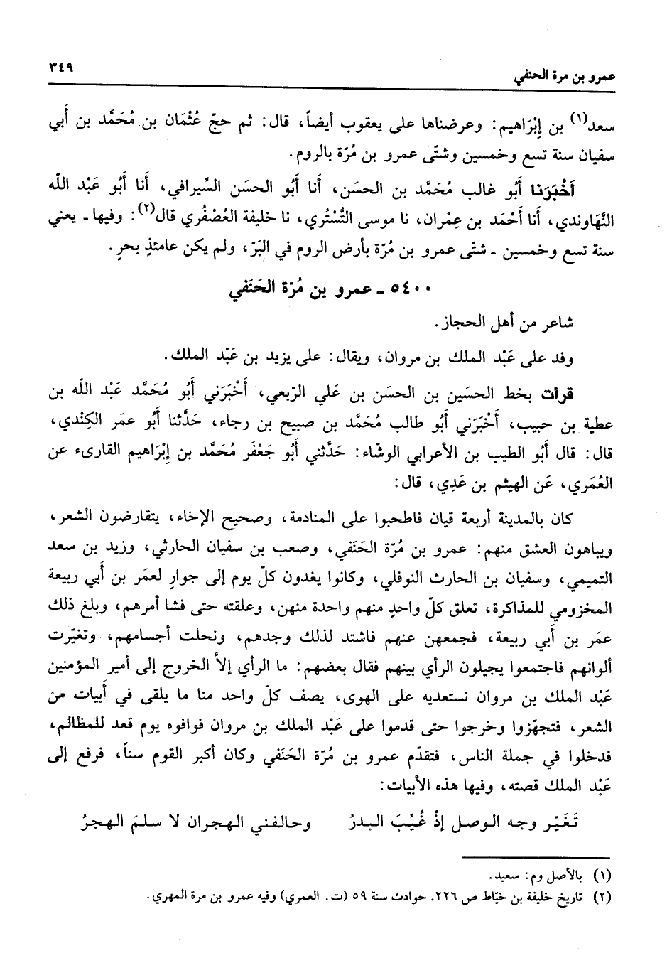 5400 - عمرو بن مرة الحنفي شاعر من أهل الحجاز وفد على عبد الملك بن مروان ويقال على يزيد بن عبد الملك قرأت بخط الحسين بن الحسن بن علي الربعي أخبرني أبو محمد عبد الله بن عطية بن حبيب أخبرني أبو طالب محمد بن صبيح بن رجاء حدثنا أبو عمر الكندي قال قال أبو الطيب بن الأعرابي الوشاء حدثني أبو جعفر محمد بن إبراهيم القارئ عن العمري عن الهيثم بن عدي قال كان بالمدينة أربعة قيان فاطحبوا على المنادمة وصحيح الإخاء يتقارضون الشعر ويباهون العشق منهم عمرو بن مرة الحنفي وصعب بن سفيان الحارثي وزيد بن سعد التميمي وسفيان بن الحارث النوفلي وكانوا يغدون كل يوم إلى جوار لعمر بن أبي ربيعة المخزومي للمذاكرة تعلق كل واحد منهم واحدة منهن وعلقته حتى فشا أمرهم وبلغ ذلك عمر بن أبي ربيعة فجمعهن عنهم فاشتد لذلك وجدهم ونحلت أجسامهم وتغيرت ألوانهم فاجتمعوا يجيلون الرأي بينهم فقال بعضهم ما الرأي إلا الخروج إلى أمير المؤمنين عبد الملك بن مروان نستعديه على الهوى يصف كل واحد منا ما يلقى في أبيات من الشعر فتجهزوا وخرجوا حتى قدموا على عبد الملك بن مروان فوافوه يوم قعد للمظالم فدخلوا في جملة الناس فتقدم عمرو بن مرة الحنفي وكان أكبر القوم سنا فرفع إلى عبد الملك قصته وفيها هذه الأبيات * تغير وجه الوصل إذ غيب البدر * وحالفني الهجران لا سلم الهجر