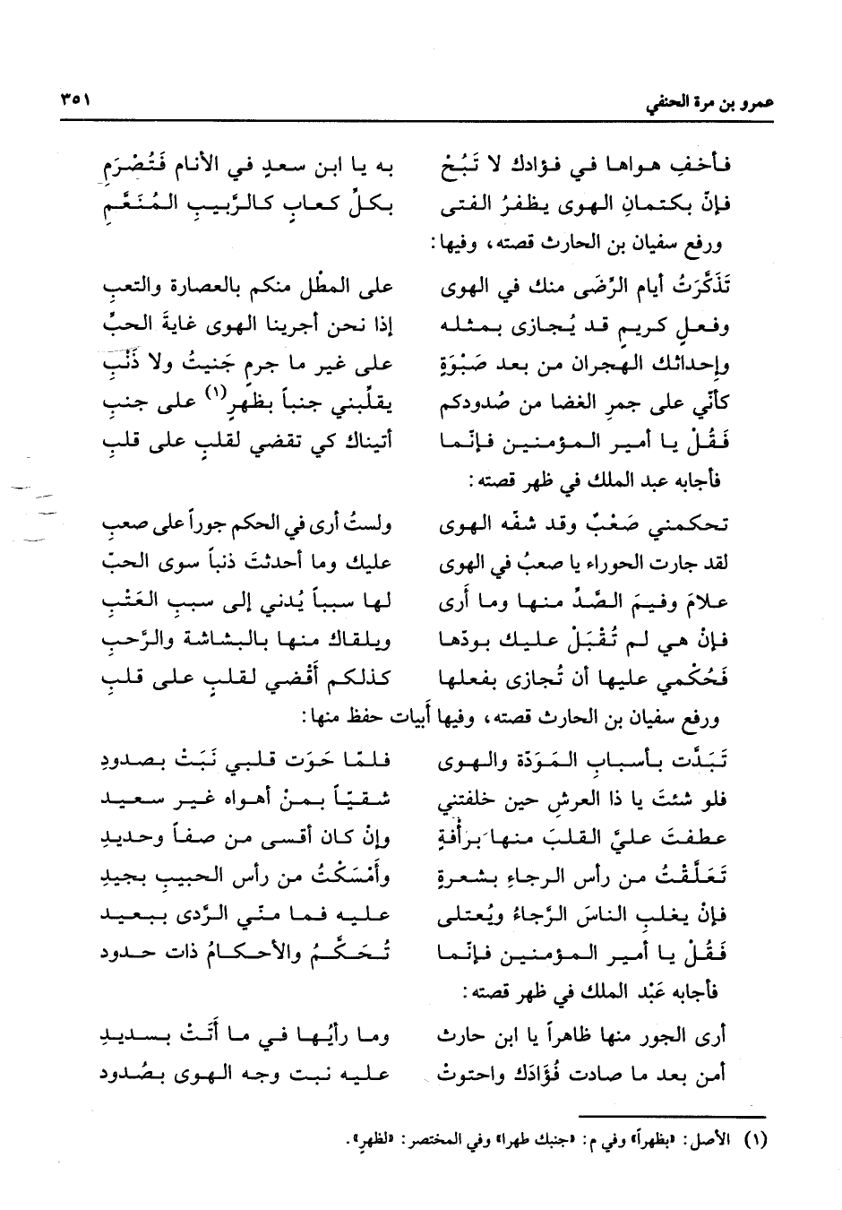 فأخف هواها في فؤادك لا تبح * به يا ابن سعيد في الأنام فتصرم فإن بكتمان الهوى يظفر الفتى * بكل كعاب كالربيب المنعم * ورفع سفيان بن الحارث قصته وفيها * تذكرت أيام الرضى منك في الهوى * على المطل منكم بالعصارة والتعب وفعل كريم قد يجازى بمثله * إذا نحن أجرينا الهوى غاية الحب وإحداثك الهجران من بعد صبوة * على غير ما جرم جنيت ولا ذنب كأني على جمر الغضا من صدودكم * يقلبني جنبا بظهر (1) على جنب فقل يا أمير المؤمنين فإنما * أتيناك كي تقضي لقلب على قلب * فأجابه عبد الملك في ظهر قصته * تحكمني صعب وقد شفه الهوى * ولست أرى في الحكم جورا على صعب لقد جارت الحوراء يا صعب في الهوى * عليك وما أحدثت ذنبا سوى الحب علام وفيم الصد منها وما أرى * لها سببا يدني إلى سبب العتب فإن هي لم تقبل عليك بودها * ويلقاك منها بالبشاشة والرحب فحكمي عليها أن تجازى بفعلها * كذلك أقضي لقلب على قلب * ورفع سفيان بن الحارث قصته وفيها أبيات حفظ منها * تبدت بأسباب المودة والهوى * فلما حوت قلبي نبت بصدود فلو شئت يا ذا العرش حين خلفتني * شقيا بمن أهواه غير سعيد عطفت علي القلب منها برأفة * وإن كان أقسى من صفا وحديد تعلقت من رأس الرجاء بشعرة * وأمسكت من رأس الحبيب بجيد فإن يغلب الناس الرجاء ويعتلى * عليه فما مني الردى ببعيد فقل يا أمير المؤمنين فإنما * تحكم والأحكام ذات حدود * فأجابه عبد الملك في ظهر قصته * أرى الجور منها ظاهرا يا ابن حارث * وما رأيها في ما أتت بسديد أمن بعد ما صادت فؤادك واحتوت * عليه نبت وجه الهوى بصدود