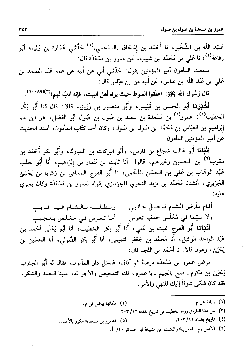[10089] أخبرنا أبو الحسن بن قبيس وأبو منصور بن زريق قالا قال لنا أبو بكر الخطيب (4) عمرو (5) بن مسعدة بن سعيد بن صول بن صول أبو الفضل هو ابن عمر إبراهيم بن العباس بن محمد بن صول بن صول وكان أحد كتاب المأمون أسند الحديث عن أمير المؤمنين المأمون أنبأنا أبو غالب شجاع بن فارس وأبو البركات بن المبارك وأبو بكر أحمد بن مقرب (6) بن الحسين وغيرهم قالوا أنا ثابت بن بندار بن إبراهيم أنا أبو تغلب عبد الوهاب بن علي بن الحسن اللخمي نا أبو الفرج المعافى بن زكريا بن يحيى الجرير أنشدنا محمد بن يزيد النحوي للحرمازي بقوله لعمرو بن مسعدة وكان يجري عليه * أقام بأرض الشام فاحتل جانبي * ومطلبه بالشام غير قريب ولا سيما في مغلس حلف تعرس * أما تعرس في مغلس بعجيب * أنبأنا أبو الفرج غيث بن علي أنا أبو بكر الخطيب أنا أبو يعلى أحمد بن عبد الواحد الوكيل أنا محمد بن جعفر التميمي أنا أبو بكر الصولي أنا الحسين بن يحيى وعون قالا نا أحمد بن النجم قال مرض عمرو بن مسعدة مرضة ثم أفاق فدخل دار المأمون فقال له أبو الجنوب يحيى بن مكرم صح بالجيم يا عمرو لك التمحيص والأجر لله علينا الحمد والشكر فقد كان شكى شوقا إليك للنهي والأمر
