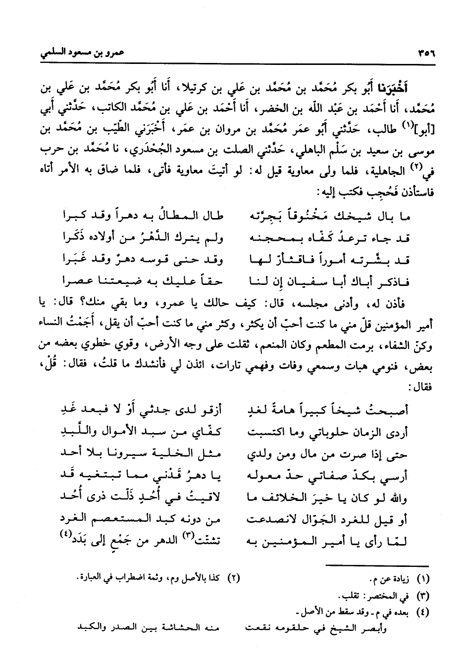 أخبرنا أبو بكر محمد بن محمد بن علي بن كرتيلا أنا أبو بكر محمد بن علي بن محمد أنا أحمد بن عبد الله بن الخضر أنا أحمد بن علي بن محمد الكاتب حدثني أبي أبو (1) طالب حدثني أبو عمر محمد بن مروان بن عمر أخبرني الطيب بن محمد بن موسى بن سعيد بن سلم الباهلي حدثين الصلت بن مسعود الجحدري نا محمد بن حرب في (2) الجاهلية فلما ولى معاوية قيل له لو أتيت معاوية فأتى فلما ضاق به الأمر أتاه فاستأذن فحجب فكتب إليه * ما بل شيخك مخنوقا بجرته * طال المطال به دهرا وقد كبرا قد جاء ترعد كفاه بمحجنه * ولم يترك الدهر من أولاده ذكرا قد بشرته أمورا فاقثأر لها * وقد حنى قوسه دهر وقد غبرا فاذكر أباك أبا سفيان إن لنا * حقا عليك به ضيعتنا عصرا * فأذن له وأدنى مجلسه قال كيف حالك يا عمرو وما بقي منك قال يا أمير المؤمنين قل مني ما كنت أحب أن يكثر وكثر مني ما كنت أحب أن يقل أجمت النساء وكن الشفاء برمت المطعم وكان المنعم ثقلت على وجه الأرض وقوي خطوي بعضه من بعض فنومي هبات وسمعي وفات وفهمي تارات ائذن لي فأنشدك ما قلت فقال قل فقال * أصبحت شيخا كبيرا هامة لغد * أزقو لدى جدثي أو لا فبعد غد أردى الزمان حلوباتي وما اكتسبت * كفاي من سبد الأموال واللبد حتى إذا صرت من مال ومن ولدي * مثل الخلية سيرونا بلا أحد أرسي بكد صفاتي حد معوله * يا دهر قدني مما تبتغيه قد والله لو كان يا خير الخلائف ما * لاقيت في أحد ذلت ذرى أحد أو قيل للغرد الجوال لانصدعت * من دونه كبد المستعصم الغرد لما رأى يا أمير المؤمنين به * تشتت (3) الدهر من جمع إلى بدد (4)