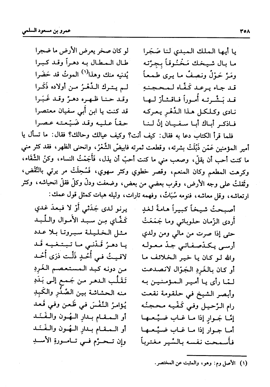 * يا أيها الملك المبدي لنا صجرا * لو كان صخر يعرض الأرض ما ضجرا ما بال شيخك مخنوقا بجرته * طال المطال به دهرا وقد كبرا ومر حول ونصف ما يرى طمعا * يدنيه منك وهذا (1) الموت قد حضرا قد جاء يرعد كفاه لمحجنه * لم يترك الدهر من أولاده ذكرا قد بشرته أمورا فاقثأر لها * وقد حنا ظهره دهر وقد غبرا * نادى وكلكل هذا الدهر يعركه * قد كنت يا ابن أبي سفيان معتصرا فاذكر أباك أبا سفيان إن لنا * حقا عليه وقد ضيعته عصرا * فلما قرأالكتاب دعا به فقال كيف أنت وكيف عيالك وحالك فقال ما تسأل يا أمير المؤمنين عمن ذبلت بشرته وقطعت ثمرته فابيض ثمرته فابيض الشعر وانحنى الظهر فقد كثر مني ما كنت أحب أن يقل وصعب مني ما كنت أحب أن يذلك فأجمت النساء وكن الشقاء وكرهت المطعم وكان المنعم وقصر خطوي وكثر سهوي فسحلت مر يرتي بالنقض وثقلت على وجه الأرض وقرب بعضي من بعض وضعفت ودل وكل فقل انحياشه وكثر ارتعاشه وقل معاشه فنومه سبات وفهمه تارات وليله هبات كمثل قول عمك * أصبحت شيخا كبيرا هامة بغد * يرنو لدى جدثي أو لا فبعد غدي أردى الزمان حلوباتي وما جمعت * كفاي من سبد الأموال واللبد حتى إذا صرت من مالي ومن ولدي * مثل الخليلة سبروتا بلا عدد أرسى يكد صفاتي جد معوله * يا دهر قدني ما تبتغيه قد والله لو كان يا خير الخلائف ما * لاقيت في أحد ذلت ذرى أحد أو كان بالغرد الجوال لانصدعت * من دونه كبد المستعصم الغرد لما رأى يا أمير المؤمنين به * تقلب الدهر من جمع إلى بدد وأبصر الشيخ في حلقومة نقعت * منه الحشاشة بين الصدر والكبد رام الرحيل وفي كفيه محجنه * يؤامر النفس في ظعن وفي قعد إما جوار إذا ما غاب ضيعها * أو المقام بدار الهون والفند أما جوار إذا ما غاب ضيعها * أو المقام بدار الهون والفند فأسمحت نفسه بالسير مغتربا * وإن تحرم في تامورة الأسد