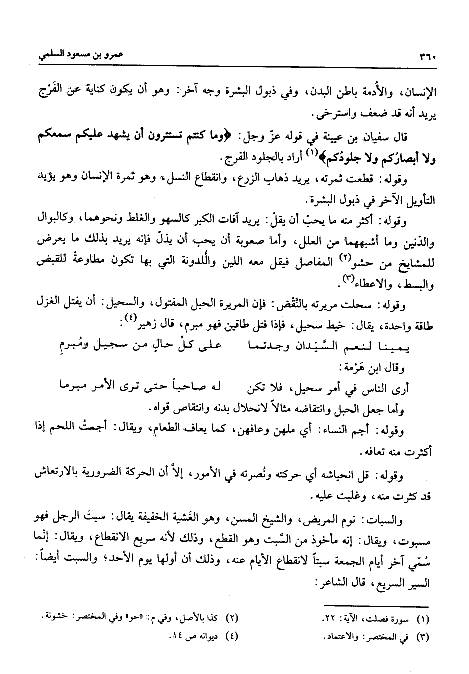 الإنسان والأدمة باطن البدن وفي ذبول البشرة وجه آخر وهو أن يكون كناية عن الفرج يريد أنه قد ضعف واسترخى قال سفيان بن عيينة في قوله عز وجل " وما كنتم تستترون أن يشهد عليكم سمعكم ولا أبصاركم ولا جلودكم " (1) أراد بالجلود الفرج وقوله قطعت ثمرته يريد ذهاب الزرع وانقطاع النسل وهو ثمرة الإنسان وهو يؤيد التأويل الآخر في ذبول البشرة وقوله أكثر منه ما يحب أن يقل يريد آفات الكبر كالسهو والغلط ونحوهما وكالبوال والدنين وما أشبههما من العلل وأما صعوبة أن يحب أن يذل فإنه يريد بذلك ما يعرض للمشايخ من حشو (2) المفاصل فيقل معه اللين واللدونة التي بها تكون مطاوعة للقبض والبسط والاعطاء (3) وقوله سحلت مريرته بالنقض فإن المريرة الحبل المفتول والسحيل أن يفتل الغزل طاقة واحدة يقال خيط سحيل فإذا فتل طاقين فهو مبرم قال زهير (4) * يمينا لنعم السيدان وجدتما * على كل حال من سجيل ومبرم * وقال ابن هرمة * أرى الناس في أمر سحيل فلا تكن * له صاحبا حتى ترى الأمر مبرما * وأما جعل الحبل وانتقاضه مثالا لانحلال بدنه وانتقاص قواه وقوله أجم النساء أي ملهن وعافهن كما يعاف الطعام ويقال أجمت اللحم إذا أكثرت منه تعافه وقوله قل انحياشه أي حركته ونصرته في الأمور إلا أن الحركة الضرورية بالارتعاش قد كثرت منه وغلبت عليه والسبات نوم المريض والشيخ المسن وهو الغشية الخفيفة يقال سبت الرجل فهو مسبوت ويقال إنه مأخوذ من السبت وهو القطع وذلك لأنه سريع الإنقطاع ويقال إنما سمي آخر أيام الجمعة سبتا لانقطاع الأيام عنه وذلك أن أولها يوم الأحد والسبت أيضا السير السريع قال الشاعر