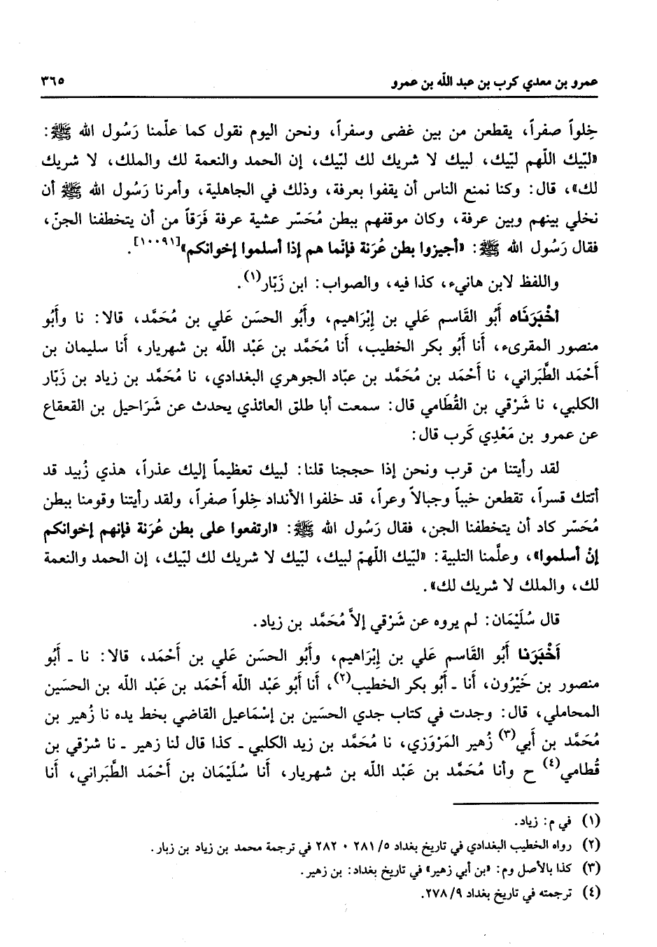 [10091] واللفظ لابن هانئ كذا فيه والصواب ابن زبار (1) أخبرناه أبو القاسم علي بن إبراهيم وأبو الحسن علي بن محمد قالا نا وأبو منصور المقرئ أنا أبو بكر الخطيب أنا محمد بن عبد الله بن شهريار أنا سليمان بن أحمد الطبراني نا أحمد بن محمد بن عباد الجوهري البغدادي نا محمد بن زياد بن زبار الكلبي نا شرقي بن القطامي قال سمعت أبا طلق العائذي يحدث عن شراحيل بن القعقاع عن عمرو بن معدي كرب قال لقد رأيتنا من قرب ونحن إذا حججنا قلنا لبيك تعظيما إليك عذرا هذي زبيد قد أتتك قسرا تقطعن خببا وجبالا وعرا قد خلفوا الأنداد خلوا صفرا ولقد رأيتنا وقومنا ببطن محسر كاد أن يتخطفنا الجن فقال رسول الله (صلى الله عليه وسلم) ارتفعوا على بطن عرنة فإنهم إخوانكم إن أسلموا وعلمنا التلبية لبيك اللهم لبيك لبيك لا شريك لك لبيك إن الحمد والنعمة لك والملك لا شريك لك قال سليمان لم يروه عن شرقي إلا محمد بن زياد أخبرنا أبو القاسم علي بن إبراهيم وأبو الحسن علي بن أحمد قالا نا أبو منصور بن خيرون أنا أبو بكر الخطيب (2) أنا أبو عبد الله أحمد بن عبد الله بن الحسين المحاملي قال وجدت في كتاب جدي الحسين بن إسماعيل القاضي بخط يده نا زهير بن محمد بن أبي زهير (3) المروزي نا محمد بن زيد الكلبي كذا قال لنا زهير نا شرقي بن قطامي (4) ح وأنا محمد بن عبد الله بن شهريار أنا سليمان بن أحمد الطبراني أنا
