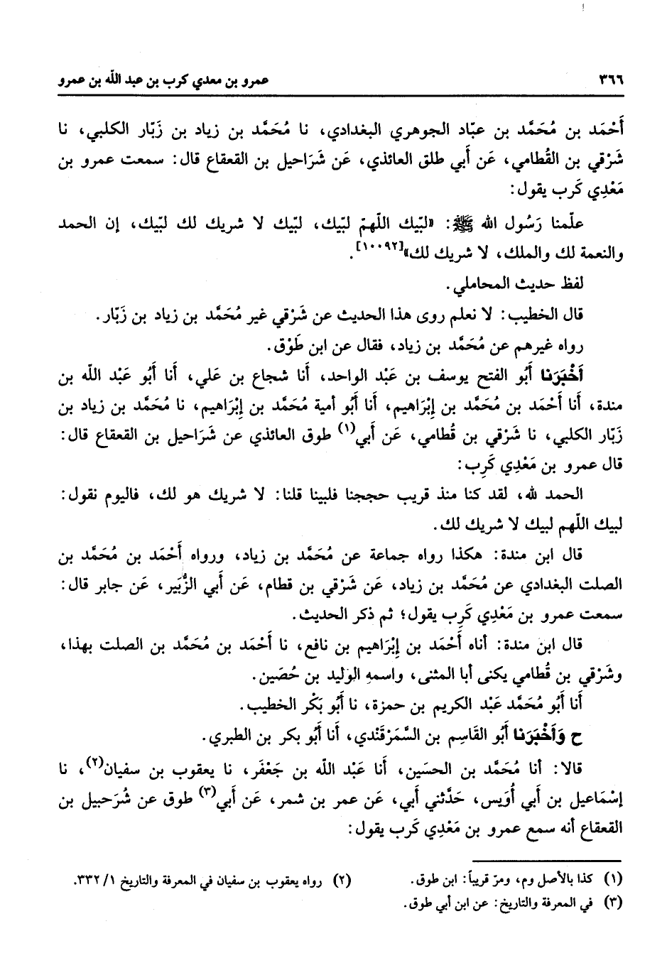 أحمد بن محمد بن عباد الجوهري البغدادي نا محمد بن زياد بن زبار الكلبي نا شرقي بن القطامي عن أبي طلق العائذي عن شراحيل بن القعقاع قال سمعت عمرو بن معدي كرب يقول علمنا رسول الله (صلى الله عليه وسلم) لبيك اللهم لبيك لبيك لا شريك لك لبيك إن الحمد والنعمة لك والملك لا شريك لك