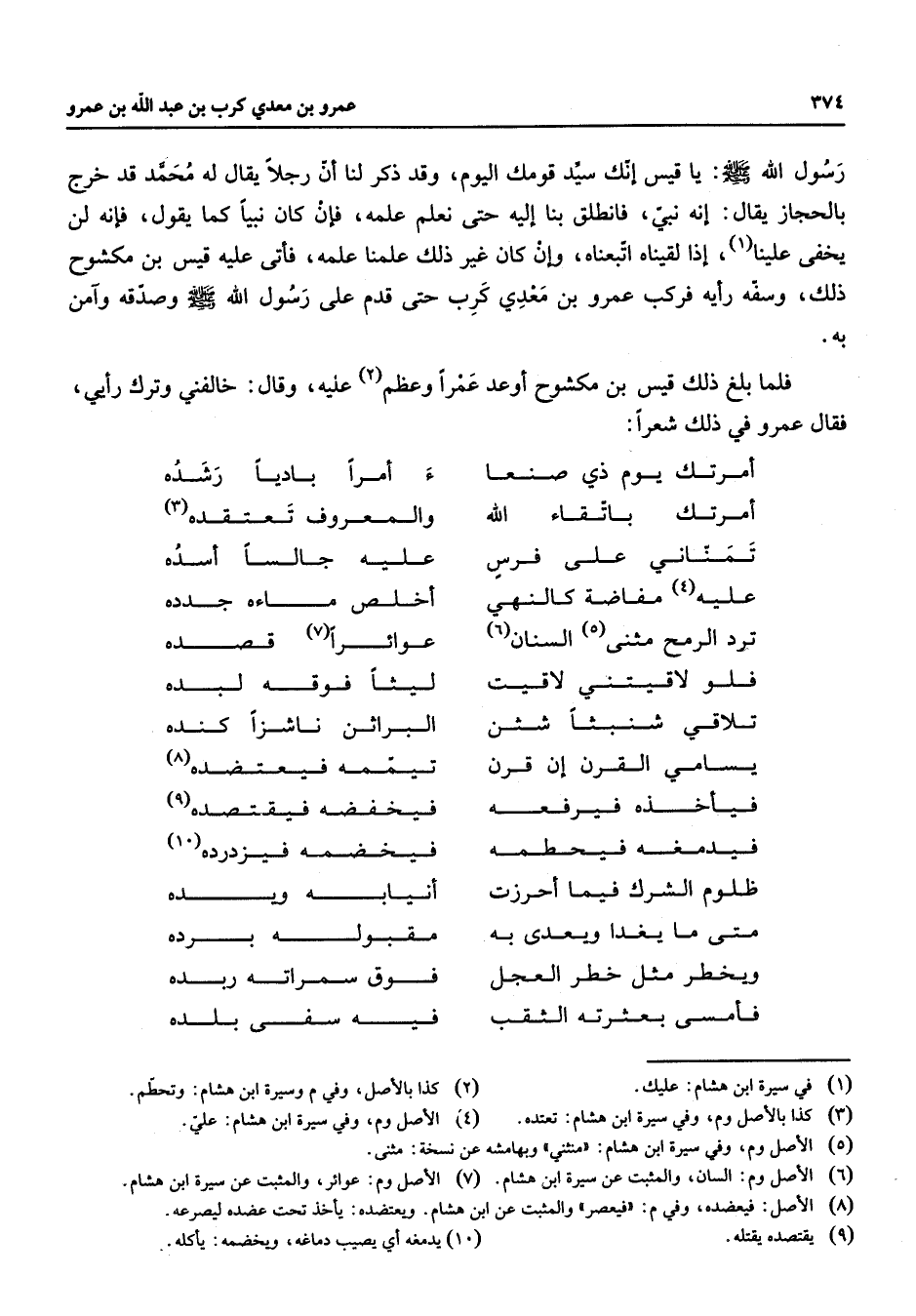 رسول الله (صلى الله عليه وسلم) يا قيس إنك سيد قومك اليوم وقد ذكر لنا أن رجلا يقال له محمد قد خرج بالحجاز يقال إنه نبي فانطلق بنا إليه حتى نعلم علمه فإن كان نبيا كما يقول فإنه لن يخفى علينا (1) إذا لقيناه اتبعناه وإن كان غير ذلك علمنا علمه فأتى عليه قيس بن مكشوح ذلك وسفه رأيه فركب عمرو بن معدي كرب حتى قدم على رسول الله (صلى الله عليه وسلم) وصدقه وآمن به فلما بلغ ذلك قيس بن مكشوح أوعد عمرا وعظم (2) عليه وقال خالفني وترك رأيي فقال عمرو في ذلك شعرا * أمرتك يوم ذي صنعاء * أمرا باديا رشده أمرتك باتقاء الله * والمعروف تعتقده (3) تمناني على فرس * عليه جالسا أسده عليه (4) مفاضة كالنهي * أخلص ماءه جدده ترد الرمح مثنى (5) السنان (6) * عوائرا (7) قصده فلو لاقيتني لاقيت * ليثا فوقه لبده تلاقي شنبثا شثن * البراثن ناشزا كنده يسامي القرن إن قرن * تيممه فيعتضده (8) فيأخذه فيرفعه * فيخفضه فيقتضده (9) فيدمغه فيحطمه * فيخضمه فيزدرده (10) ظلوم الشرك فيما أحرزت * أنيابه ويده متى ما يغدا ويعدى به * مقبوله برده ويخطر مثل خطر العجل * فوق سمراته ربده فأمسى بعثرته الثقب * فيه سفى بلده